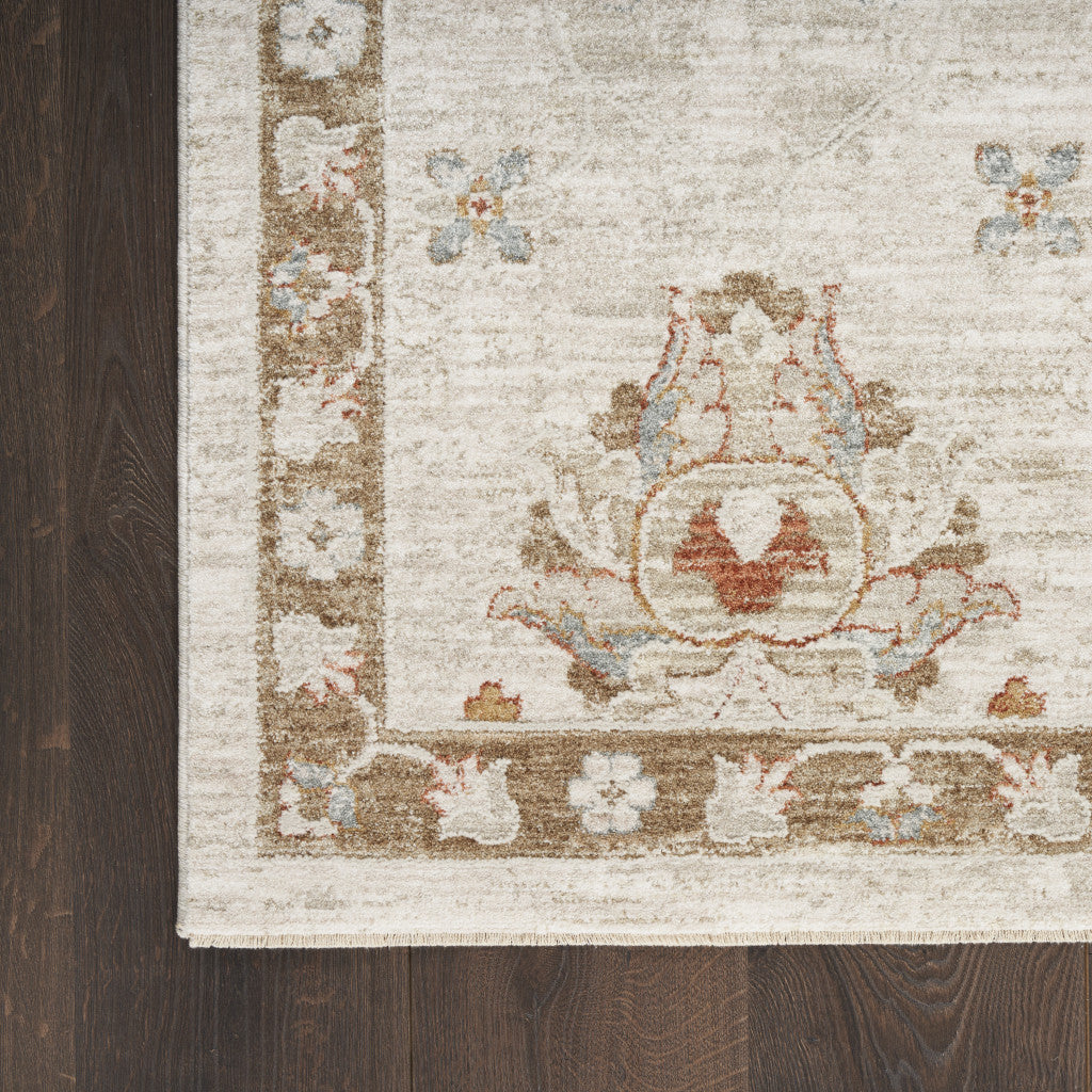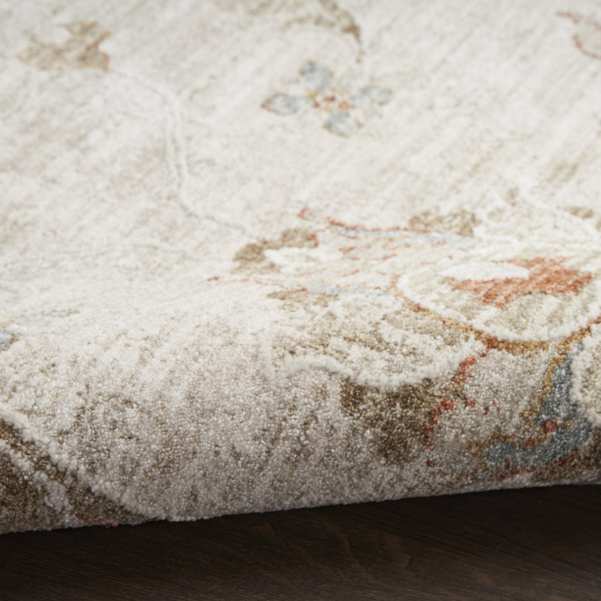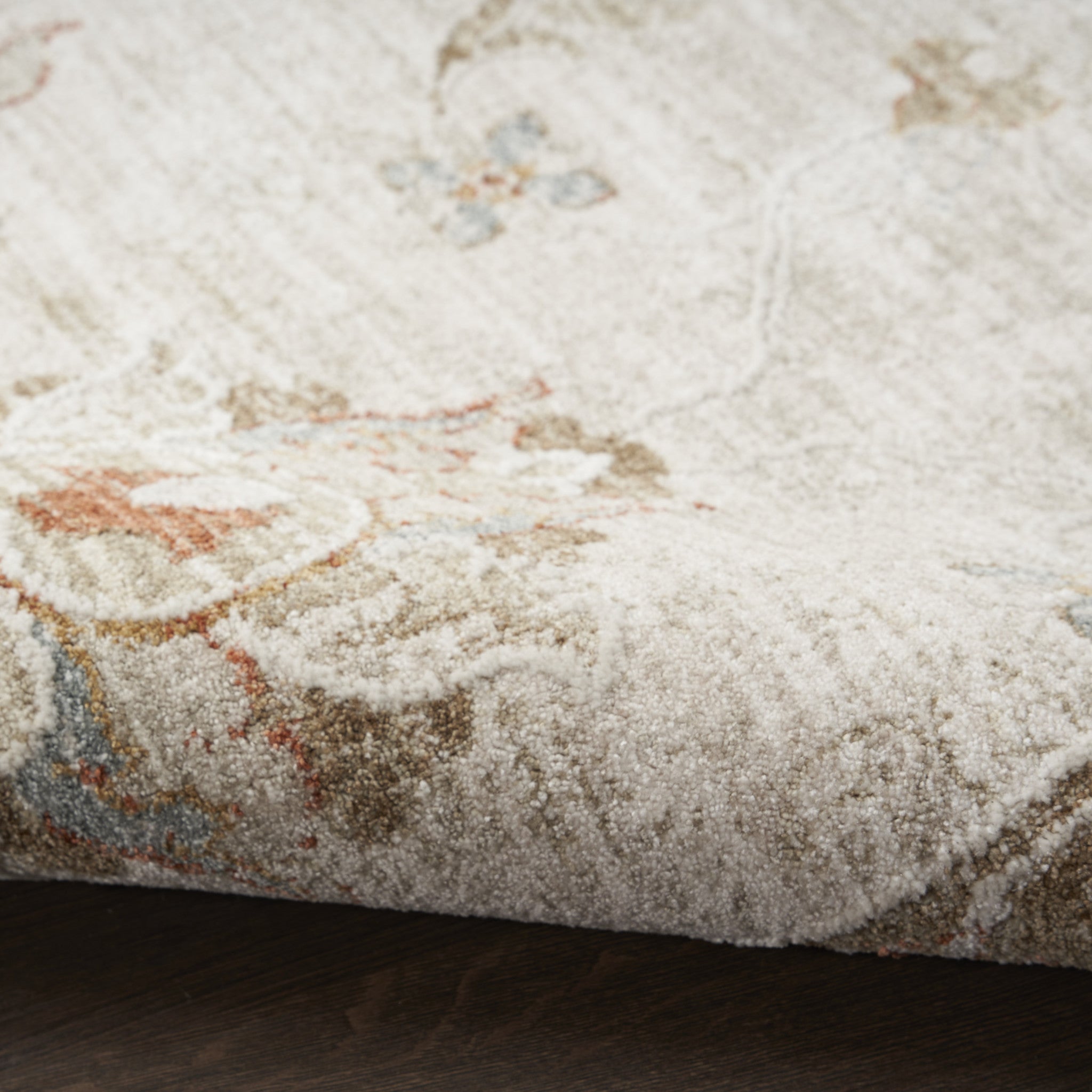 - Machine made polyester area rug in rustic ivory color, easy to care for with vacuuming.