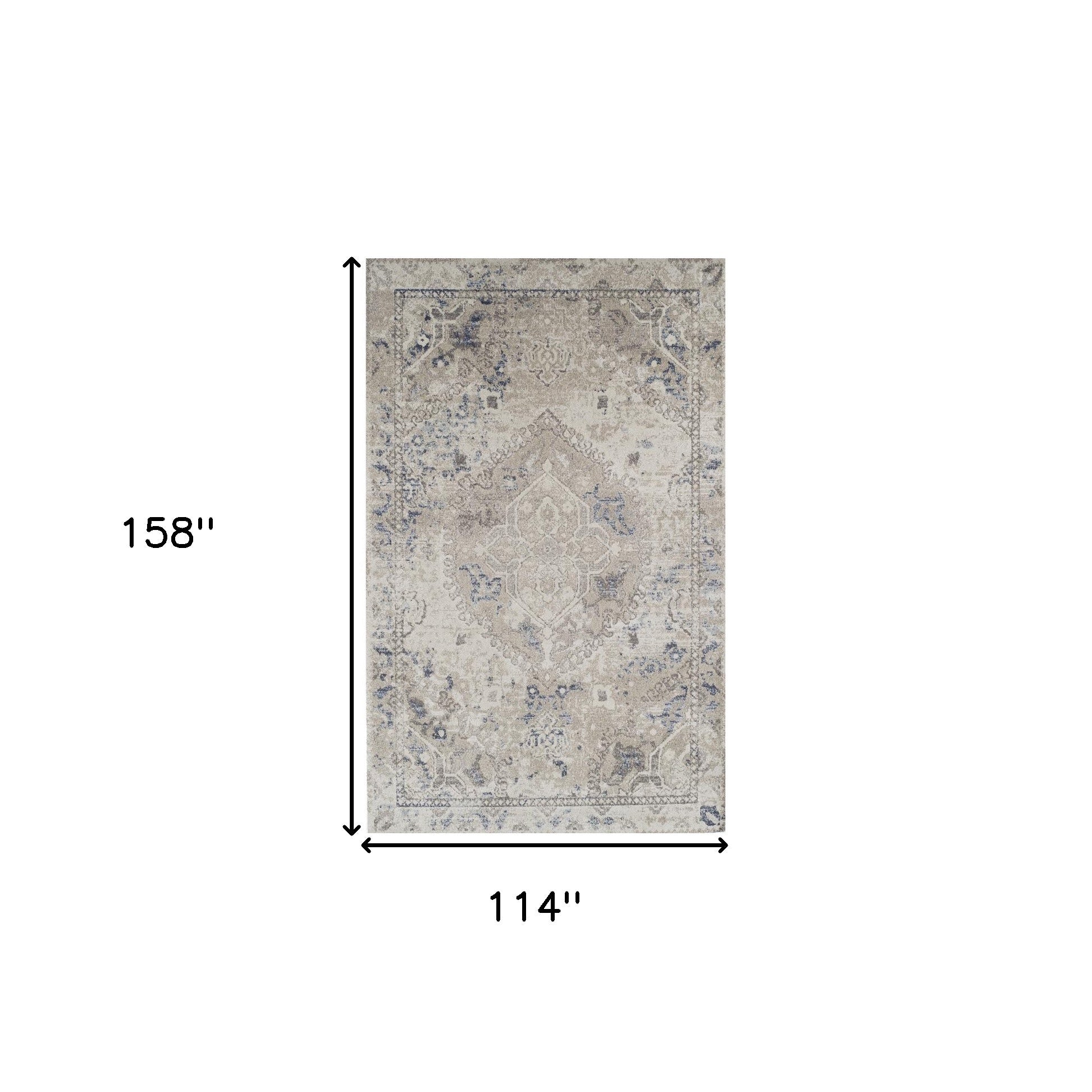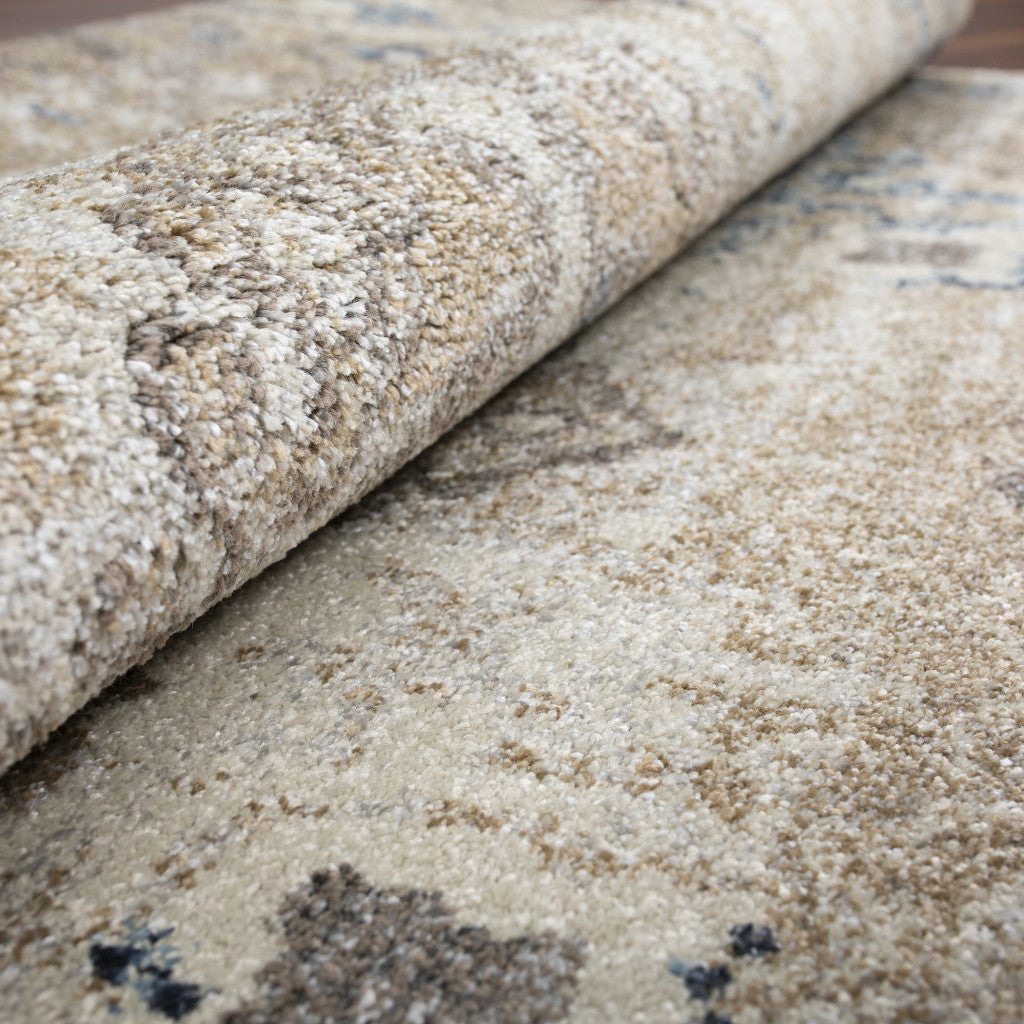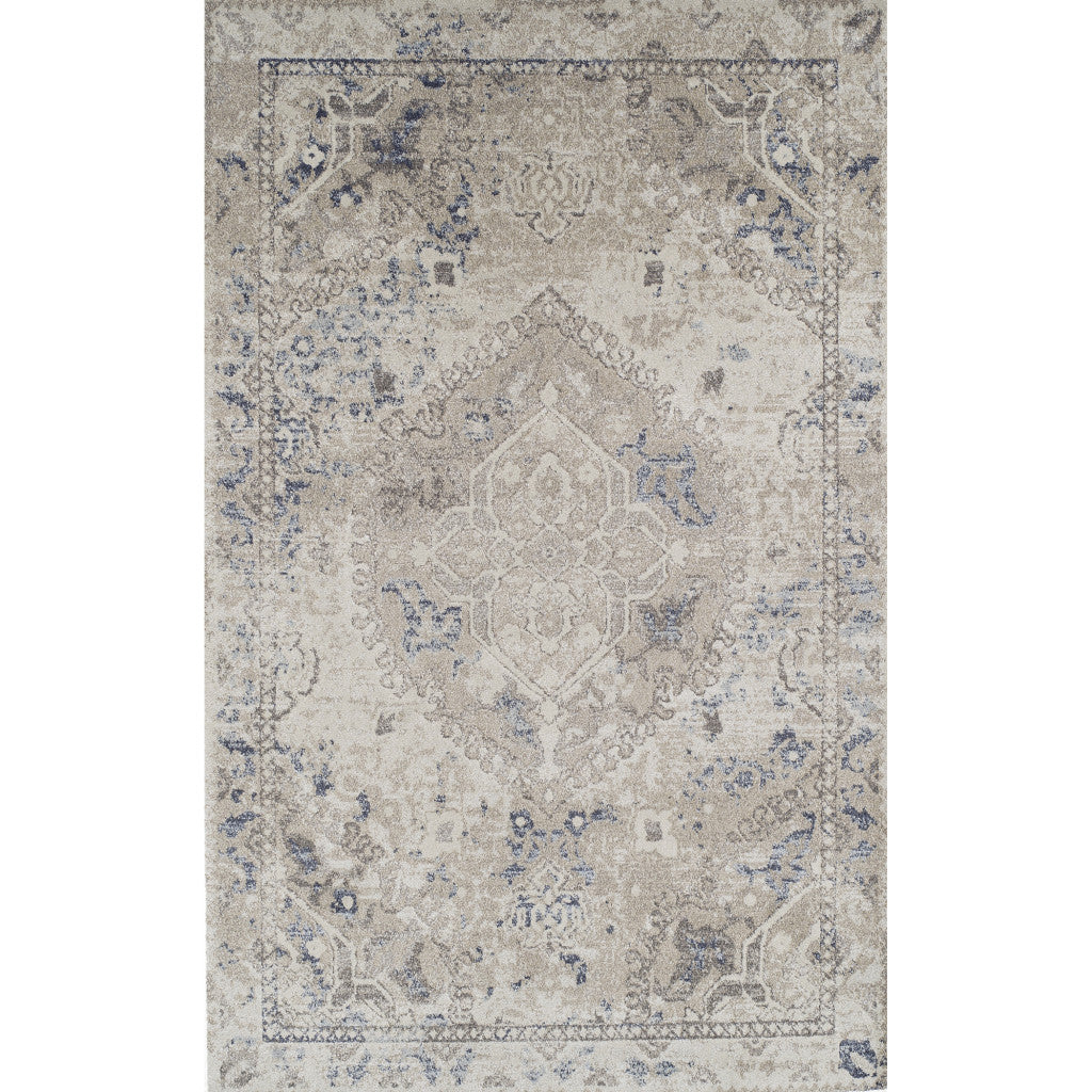 - Machine-made ivory area rug with polypropylene material.
