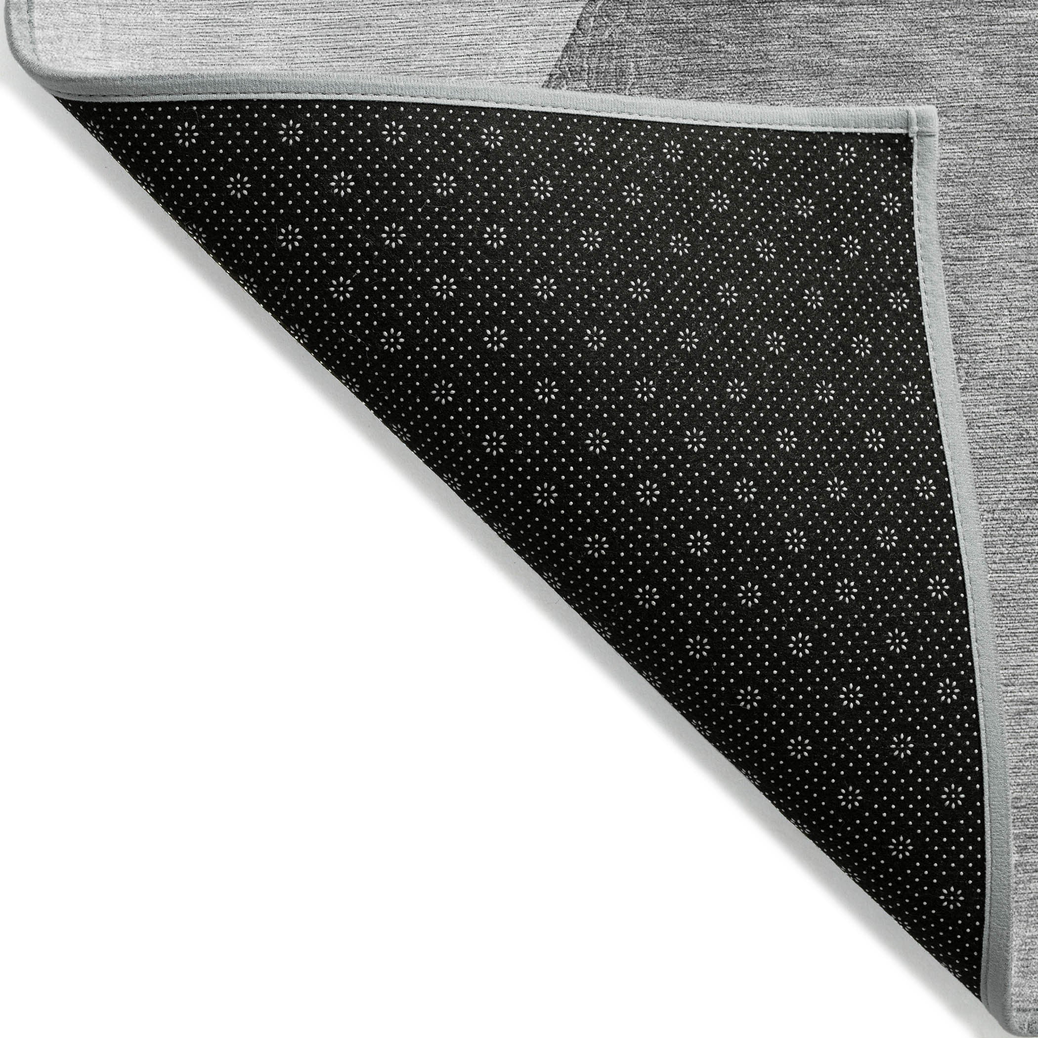 - A felt backing covers this rug to finish the look, keep the fibers in place, and help to keep the rug from slipping.