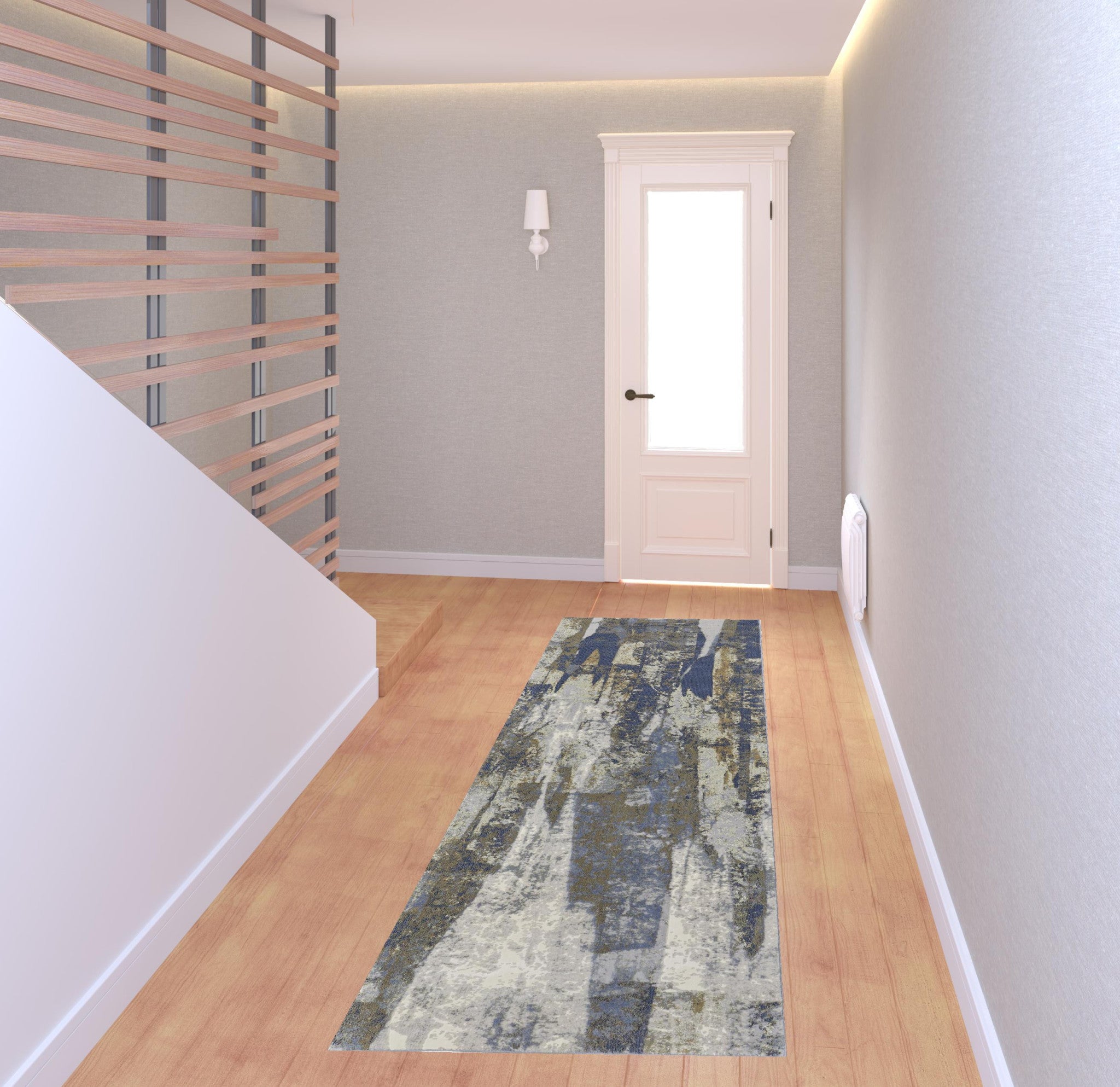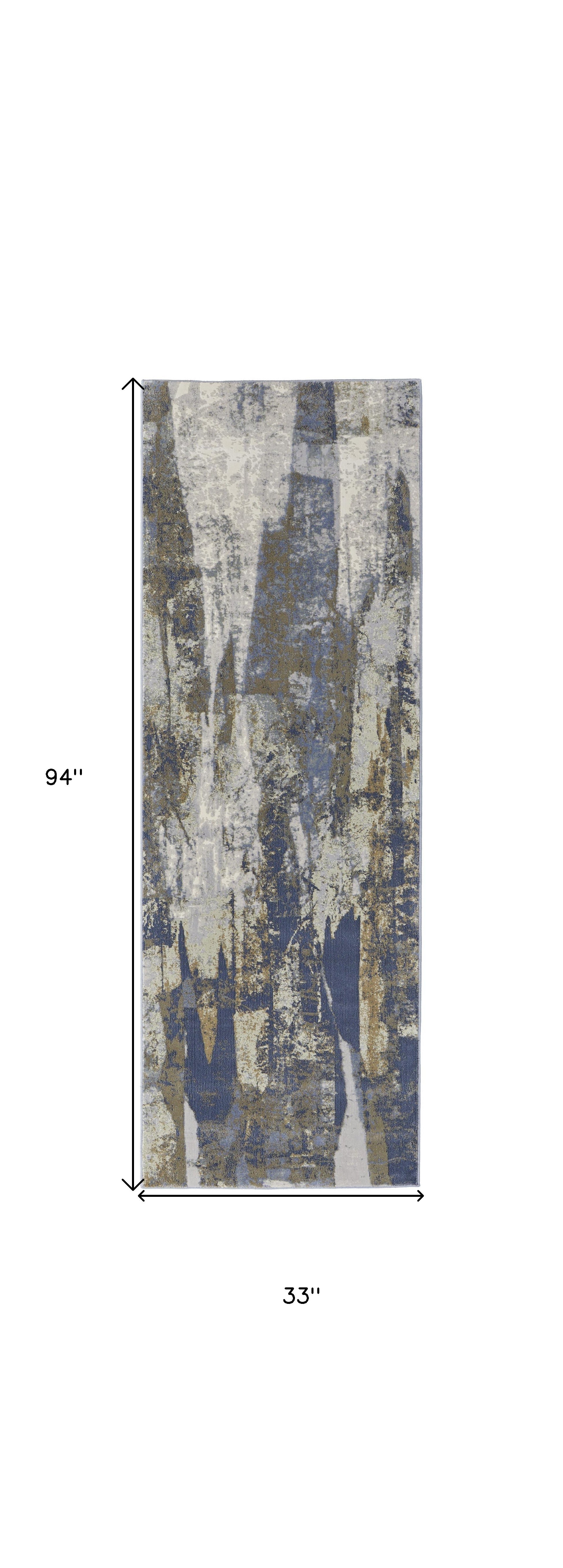 - Machine-made area rug with a purposeful worn faded look in a stylish blue and gray color scheme.