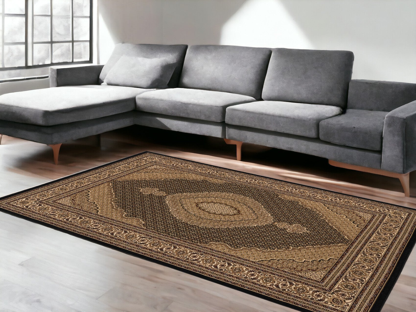 - Transitional style rug in beige and black.