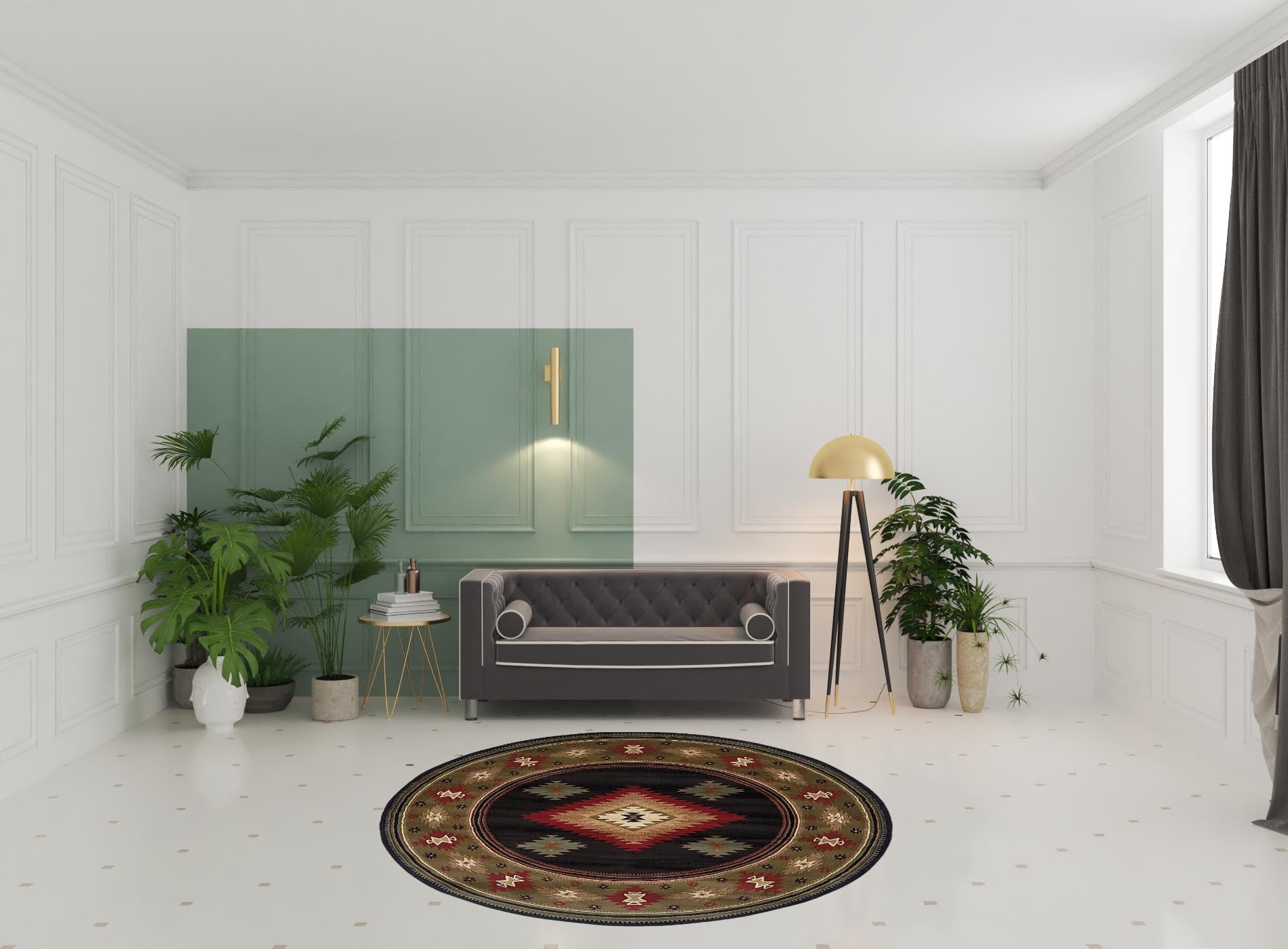 - Rug colors include shades of beige and green