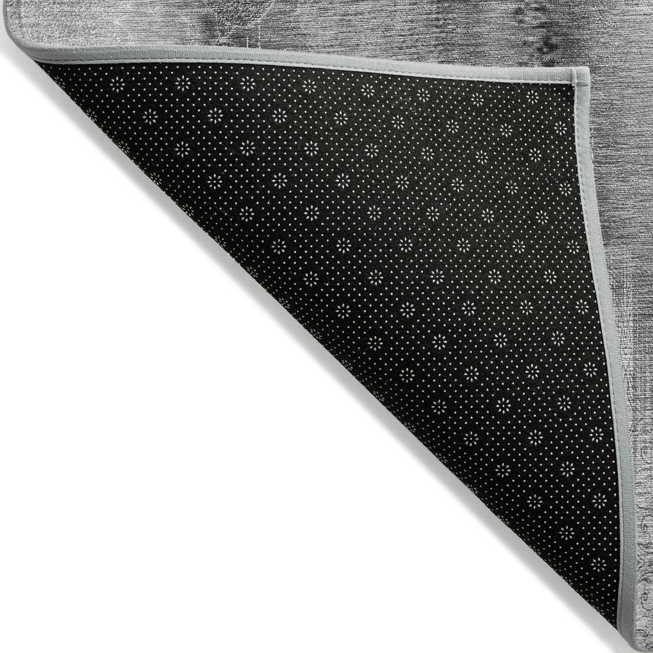 - A felt backing covers this rug to finish the look, keep the fibers in place, and help to keep the rug from slipping.