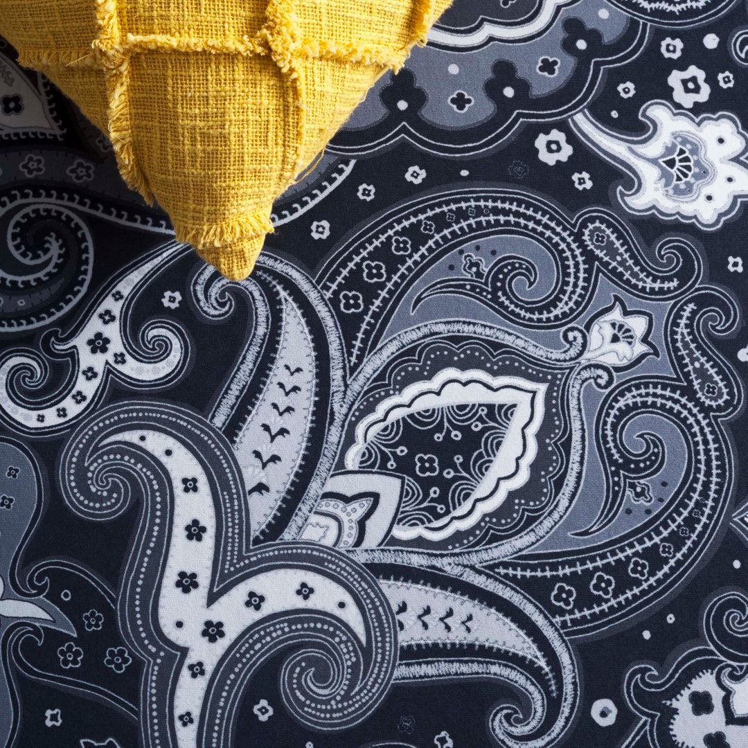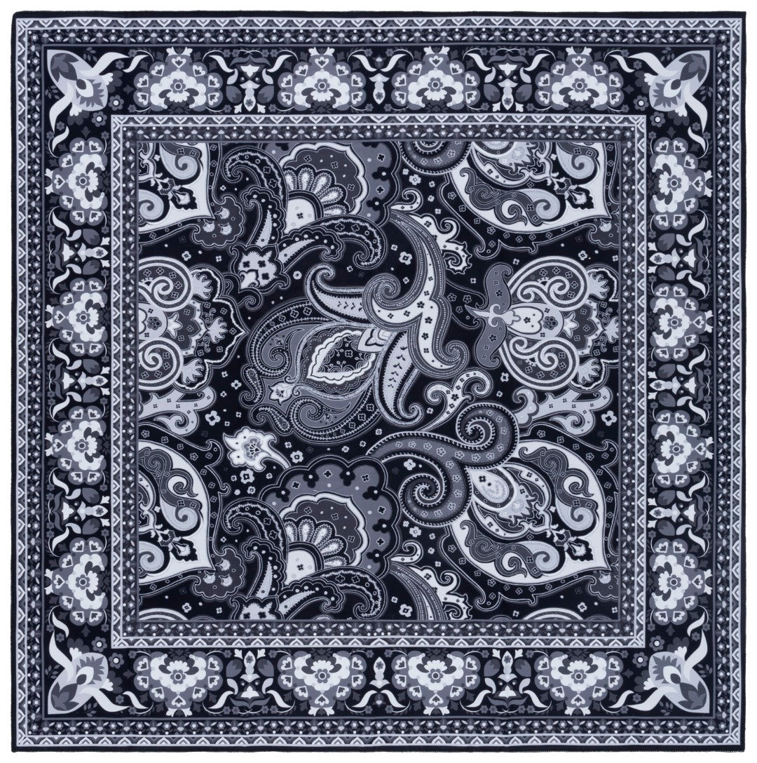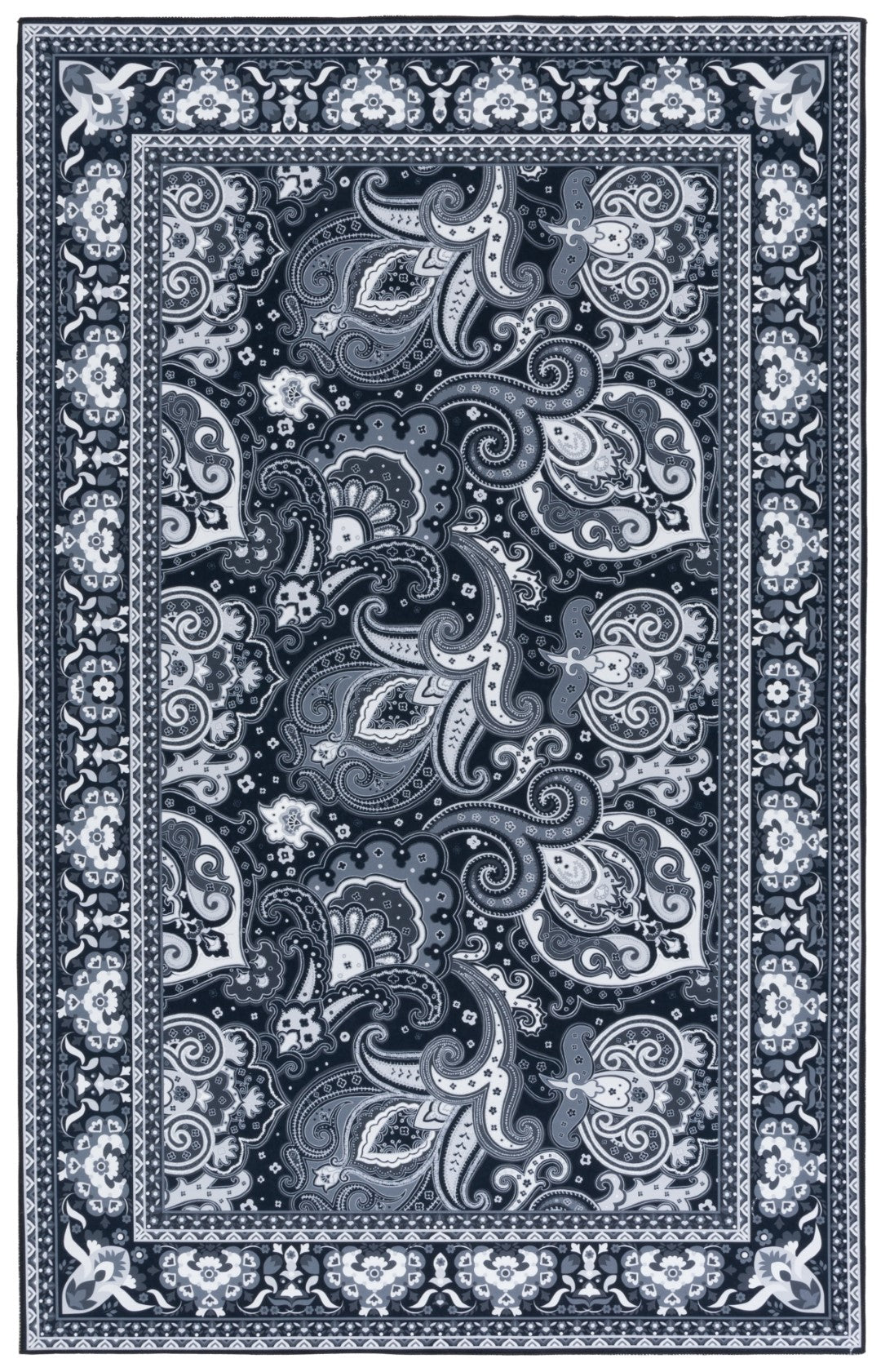 Made from high-quality polyester, this rug offers both comfort and longevity. The sophisticated black and grey hues are artfully arranged in a traditional style, featuring an intricate paisley pattern that radiates elegance and class. The borders are adorned with detailed floral and geometric motifs, creating a timeless look that complements any decor.