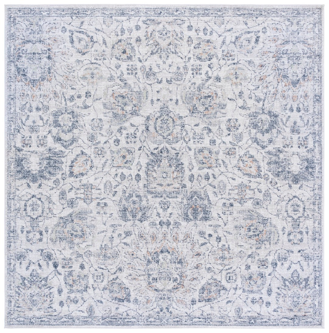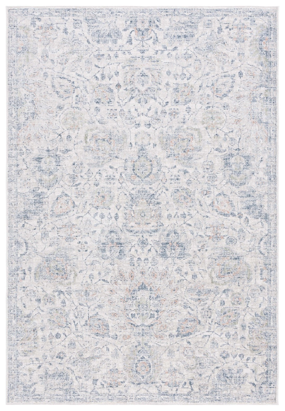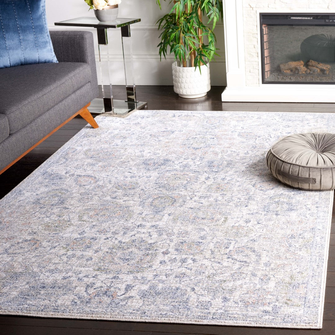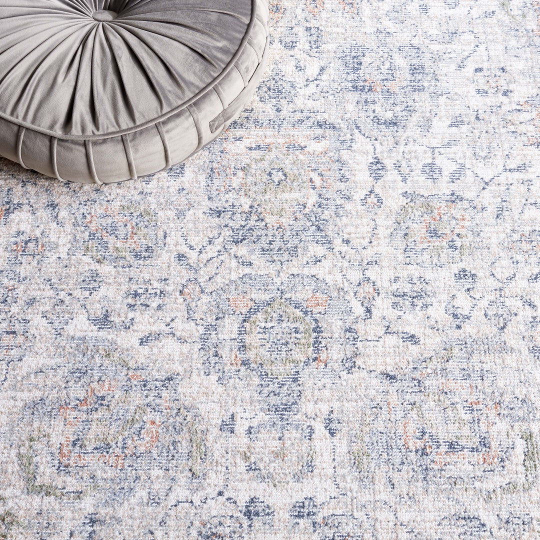 The rug showcases an intricate pattern that echoes time-honored designs, updated with a modern color palette of ivory, dark grey, and subtle hints of sage, providing a versatile look that complements both contemporary and traditional interiors.