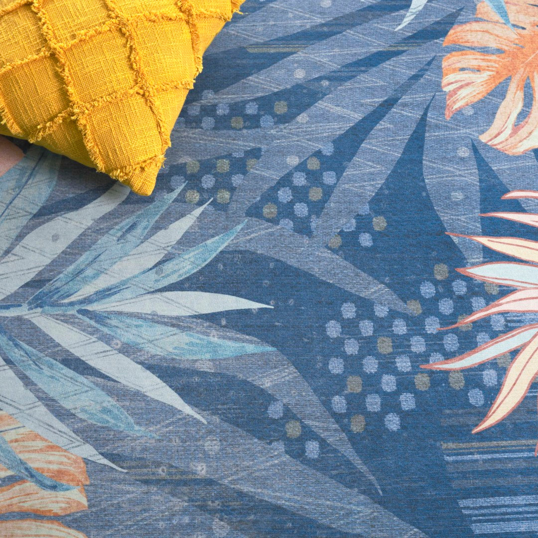 Our power-loomed treasure is expertly woven in China using the finest polyester materials, ensuring durability for extensive use. A harmonious blend of blue and light blue tones creates an alluring canvas for the vibrant tropical leaf pattern that gracefully adorns the surface.