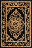 The striking black base of this magnificent carpet is beautifully contrasted by an elegant pattern that features traditional motifs with hints of tan and beige, adding a timeless aesthetic to your decor. Its ornate central medallion is surrounded by floral elements and bordered by a delicate yet sophisticated interlacing design.