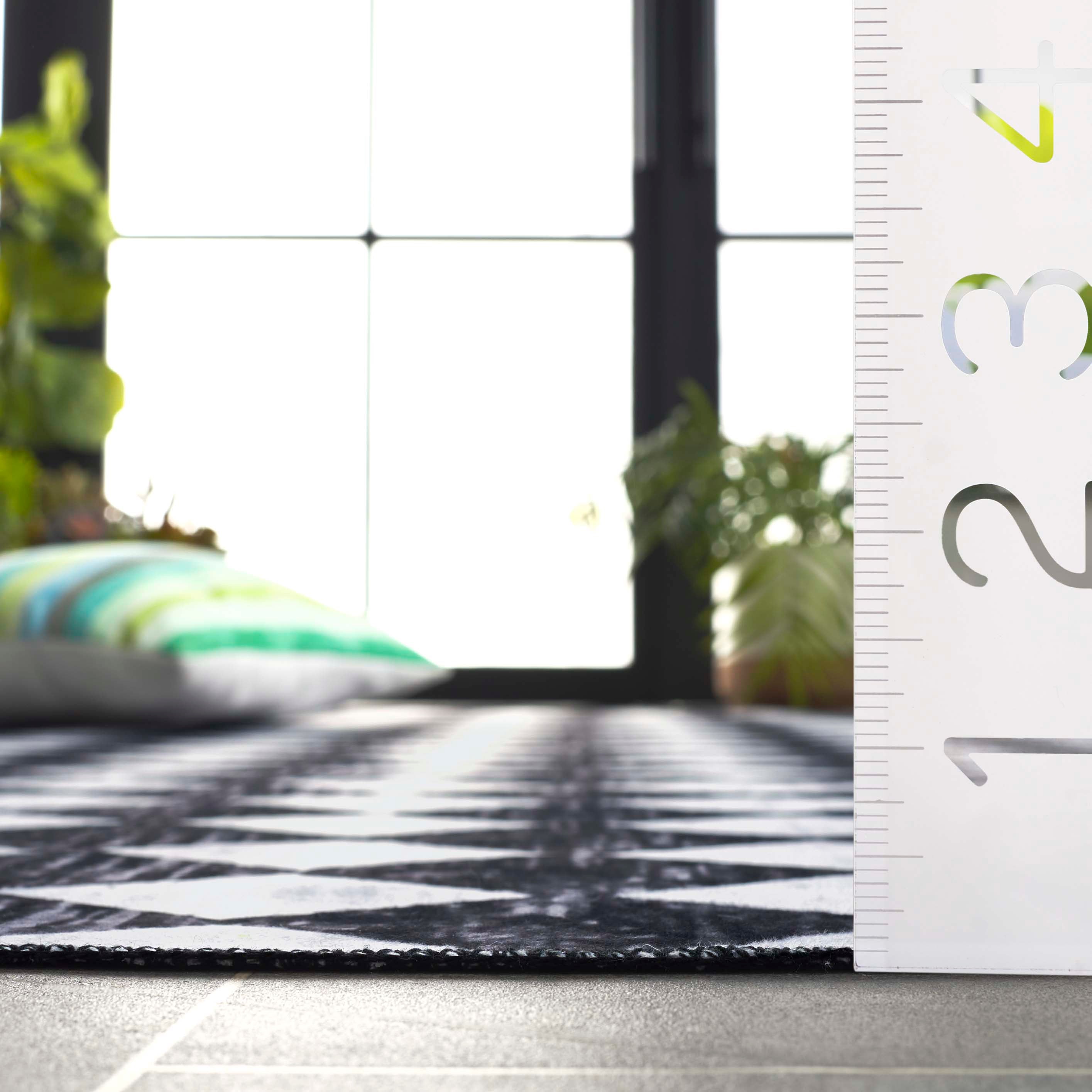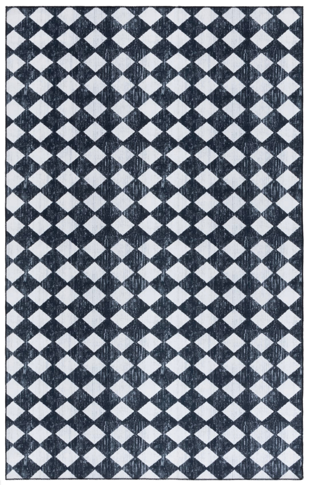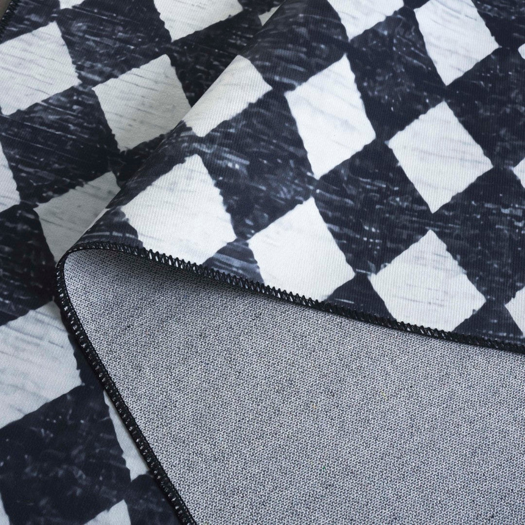 The striking geometric pattern displayed on our area rug enhances your space with a bold, contemporary edge. The repeating black and ivory squares create a dynamic visual effect that draws the eye and anchors the room effortlessly.