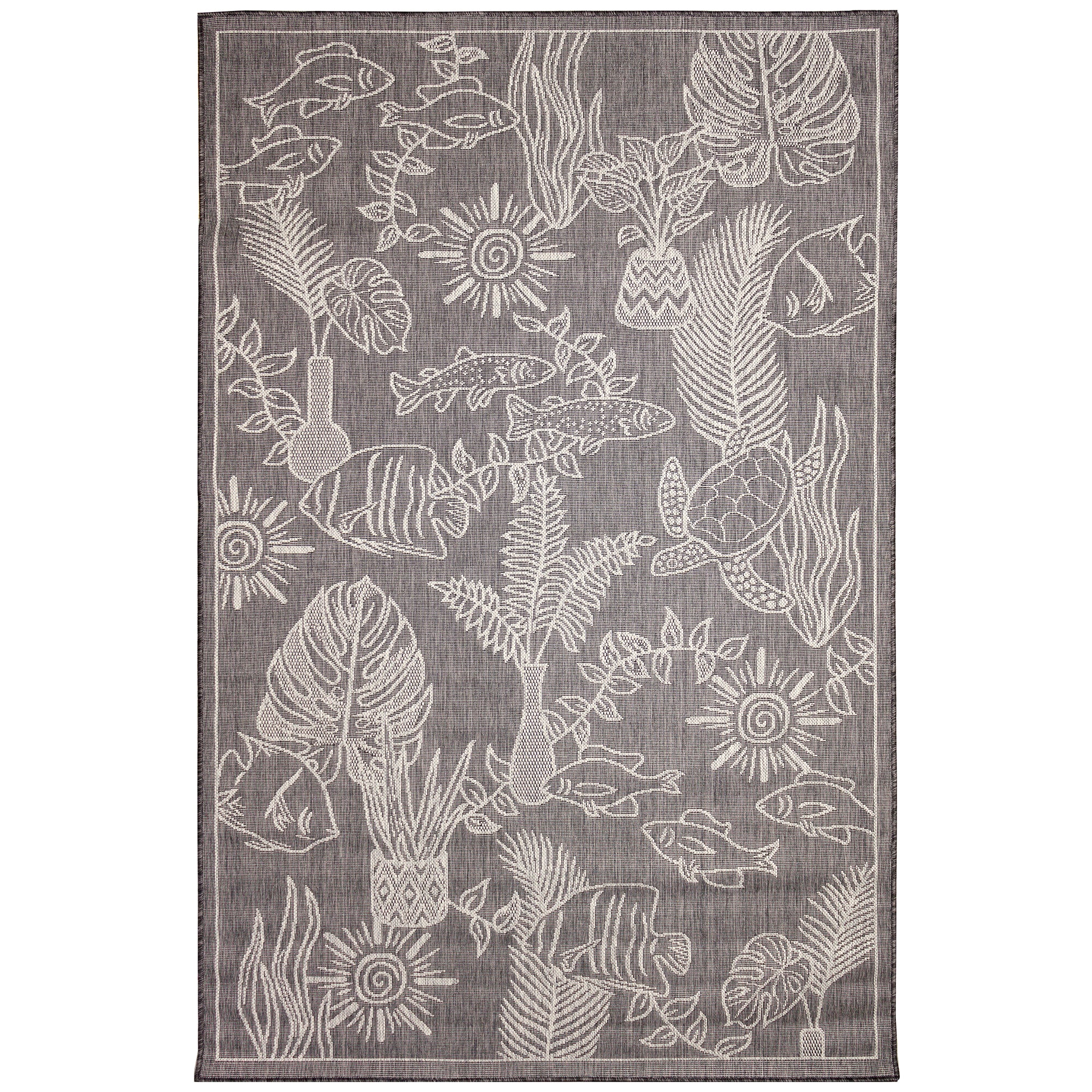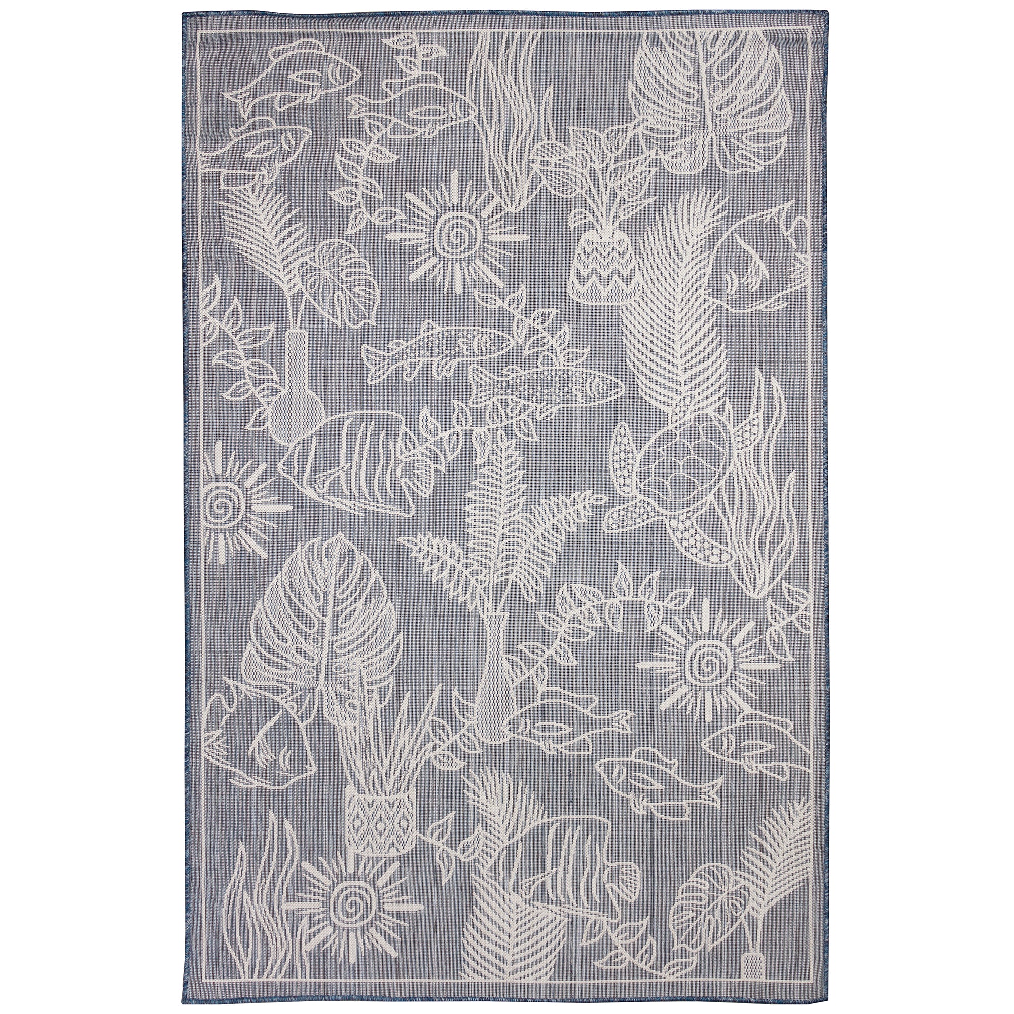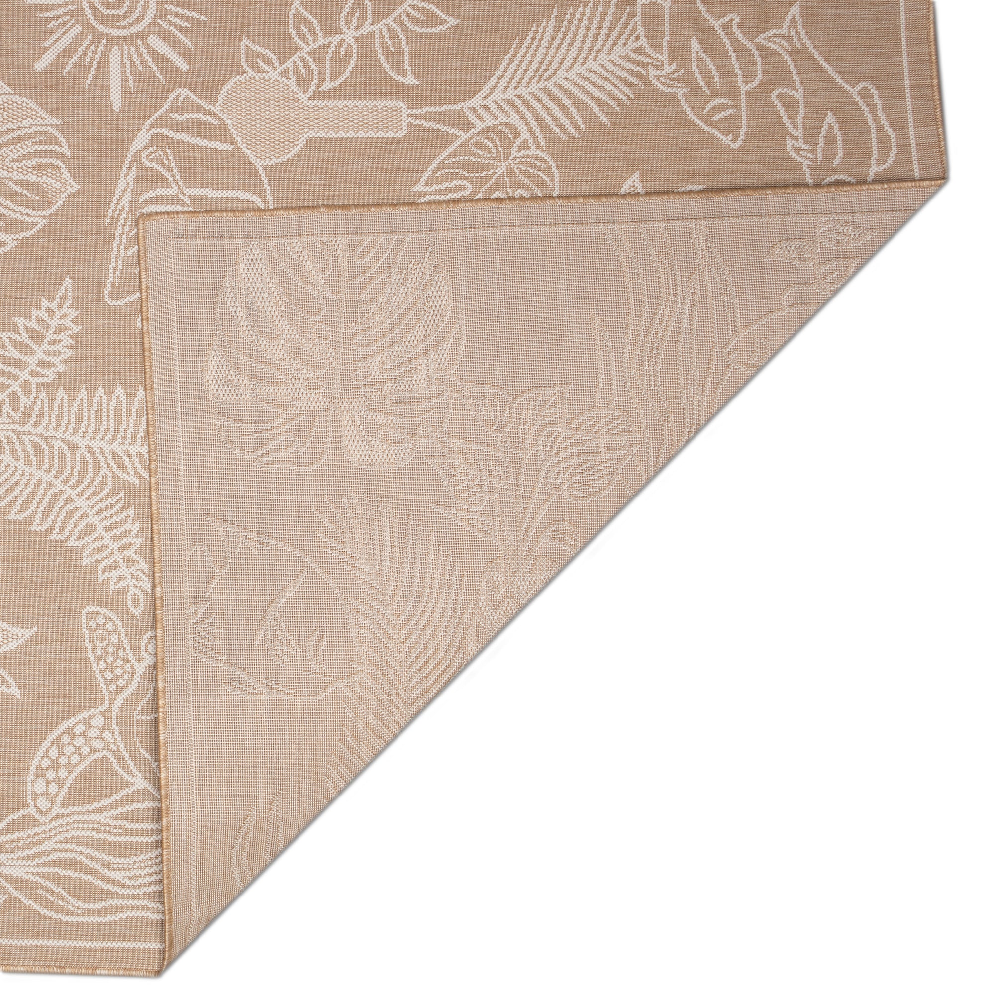 - Feature 11: This decorative area rug features a whimsical collection of botanical leaves and ocean life scattered throughout in ivory on a sand background.