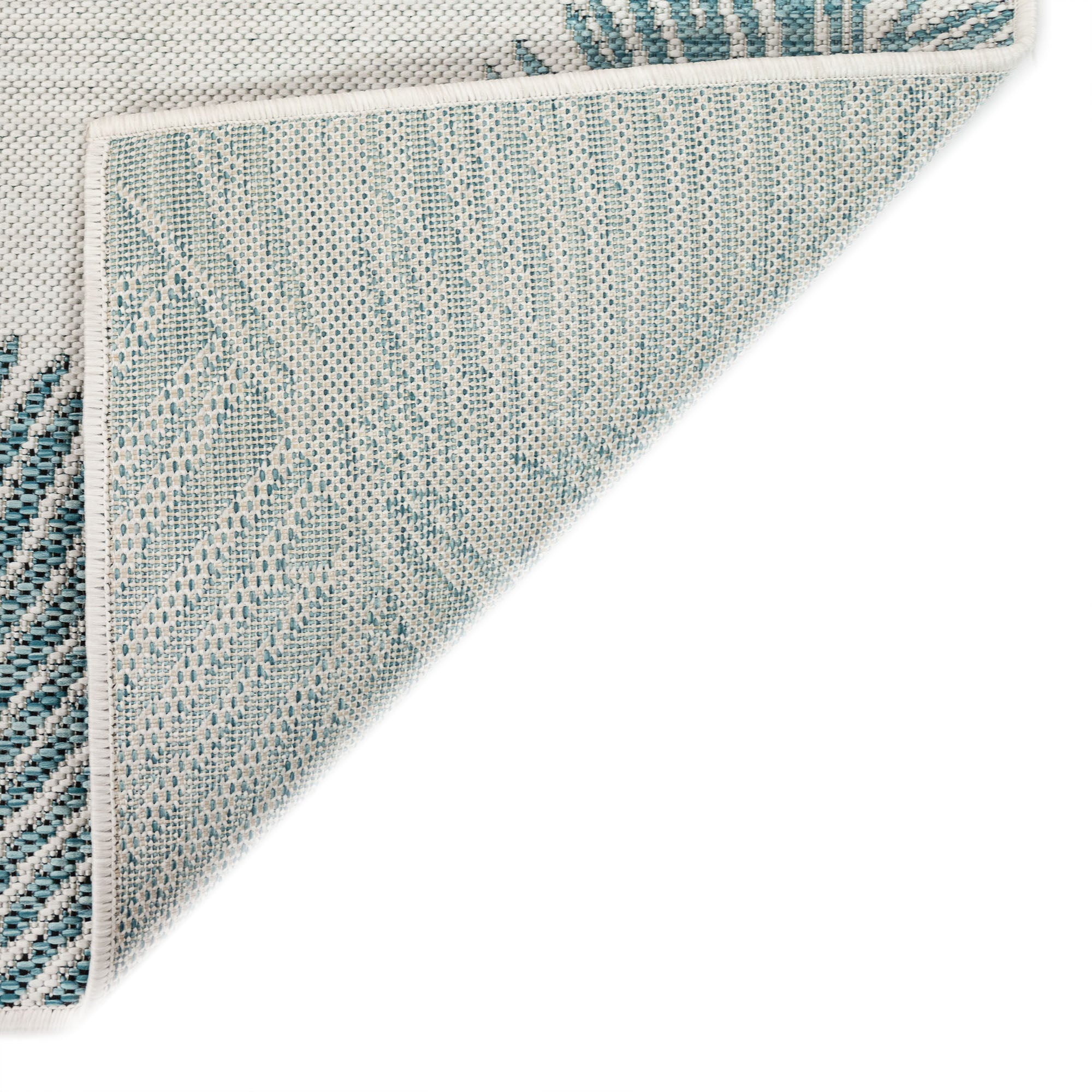 - Feature 11: This decorative modern palm leaf area rug is designed with an ivory background accented by aqua palm leaves.