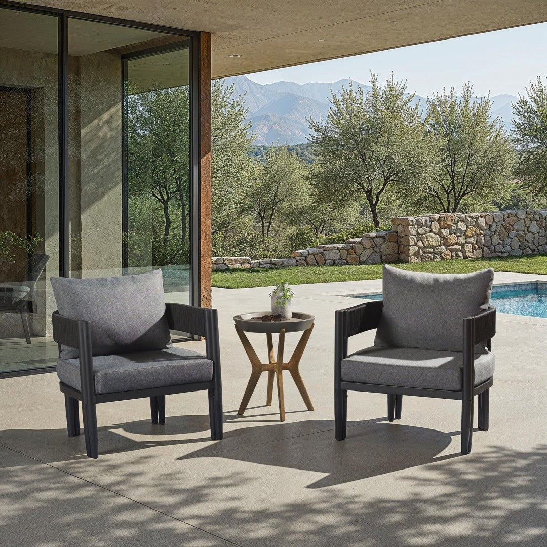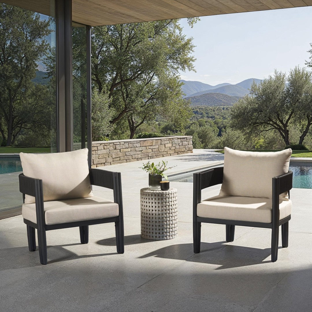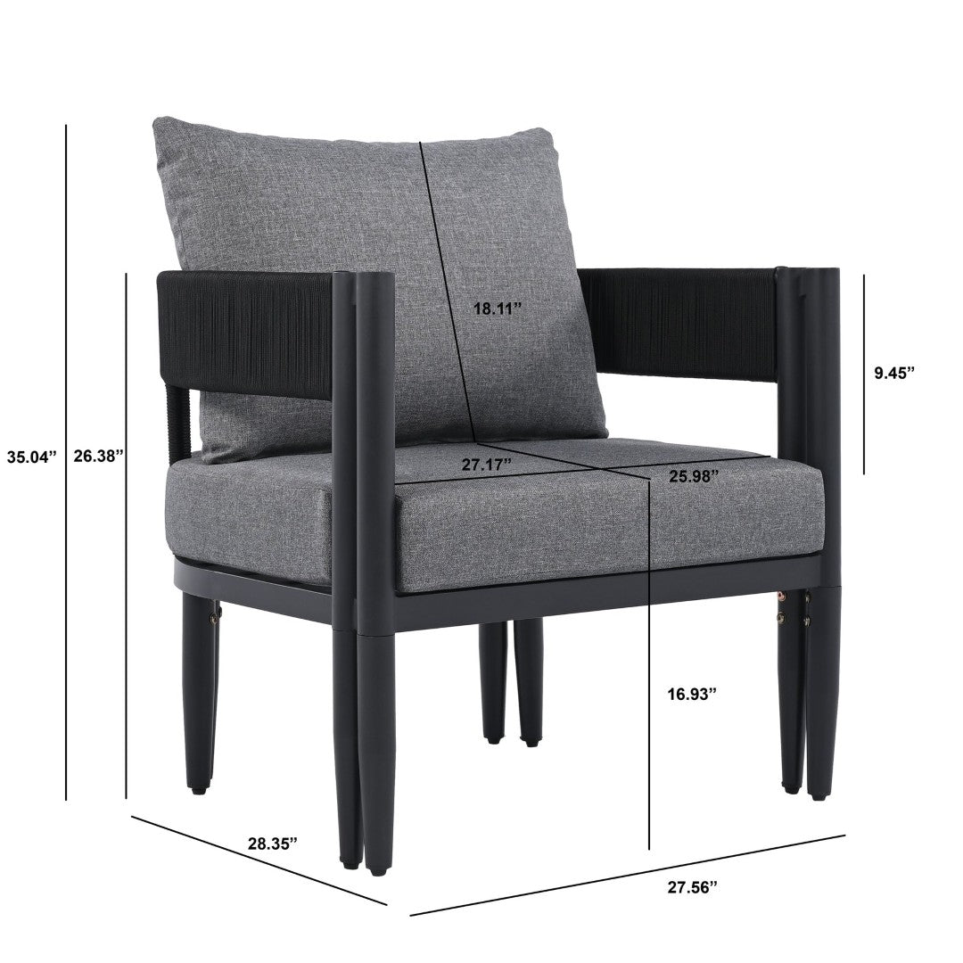 Elevate your patio, deck, or balcony with a modern pair of outdoor chairs designed for both style and lasting comfort. These chairs combine a sturdy steel frame, weather-resistant rope accents, and plush fabric cushions to create an inviting seating area that complements contemporary outdoor décor while standing up to everyday use.