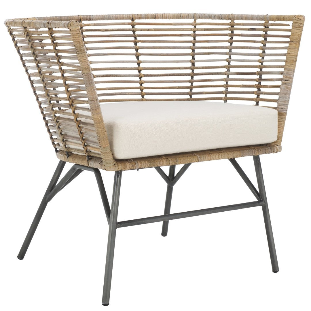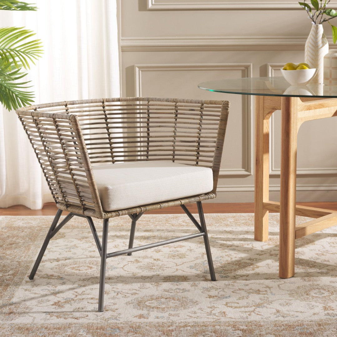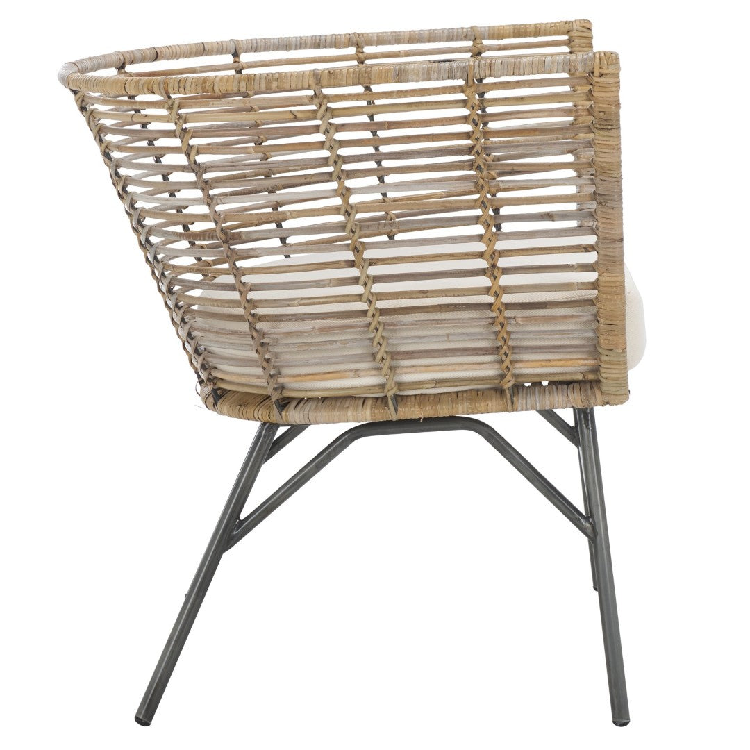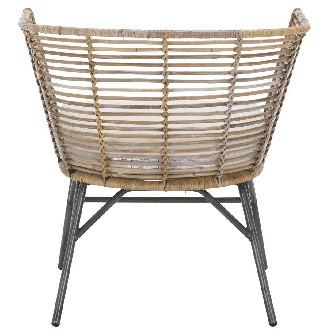 Bring Effortless Coastal Charm And Everyday Comfort To Your Dining Room With This Camira Dining Chair. A Woven Rattan Back And Generous Padded Seat Combine Natural Texture With Supportive Ergonomics, While Slender Black Metal Legs Lend A Contemporary Contrast—Making This Chair Ideal For Casual Meals, Relaxed Entertaining, Or As An Accent Seat In Living Areas.