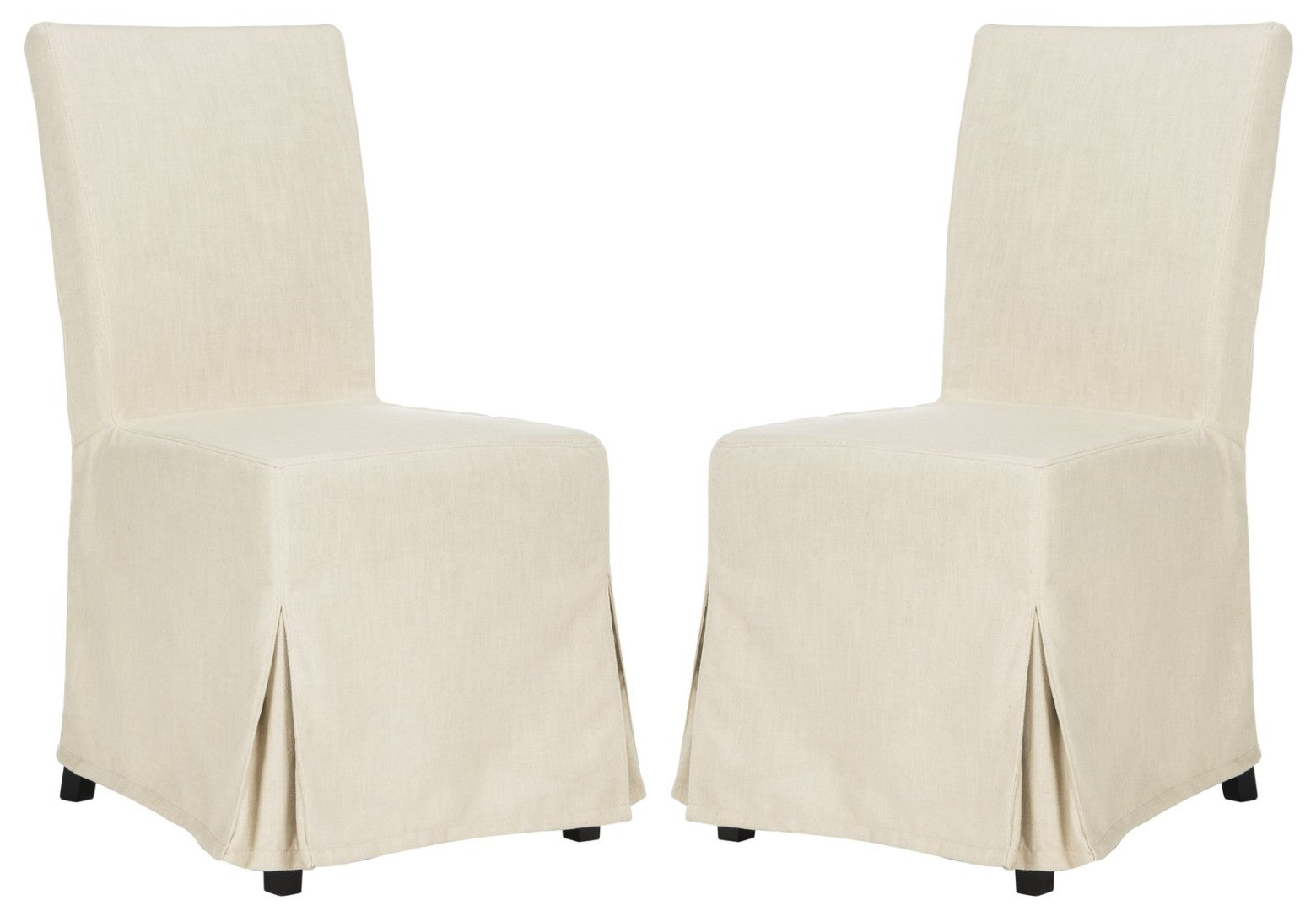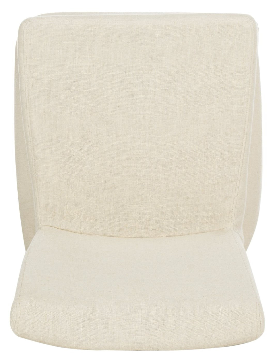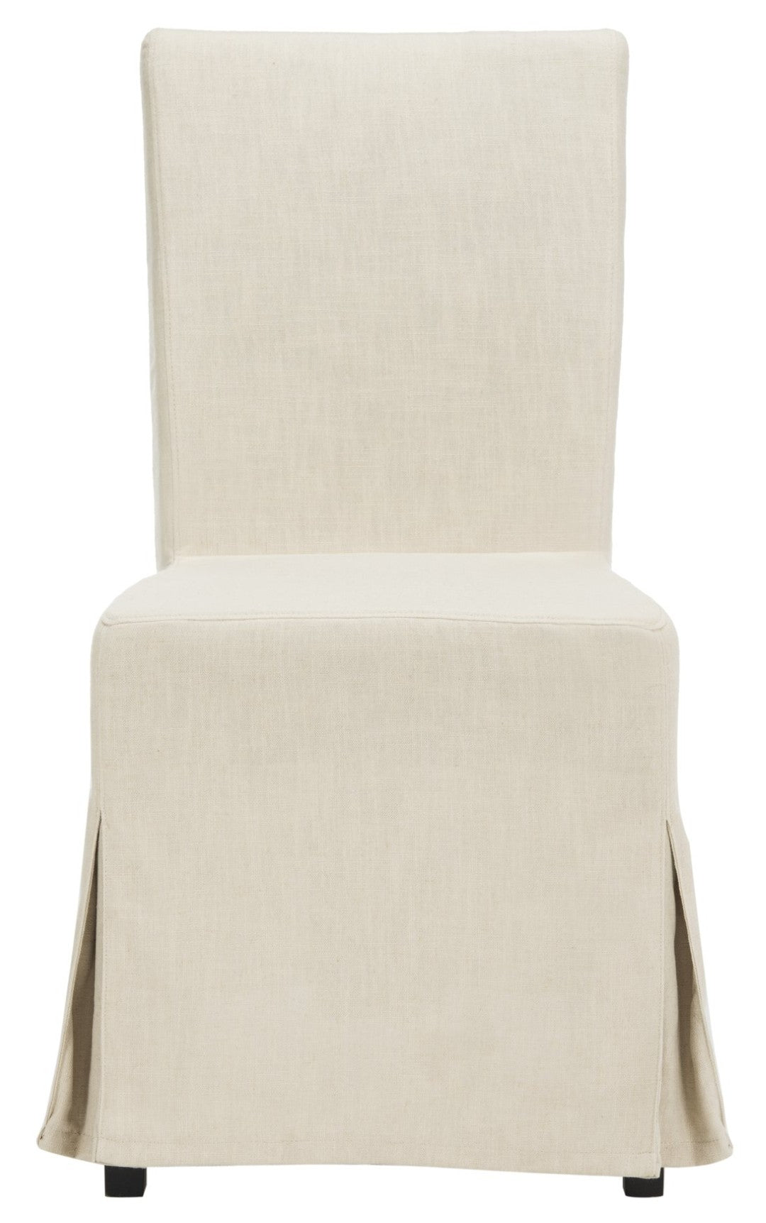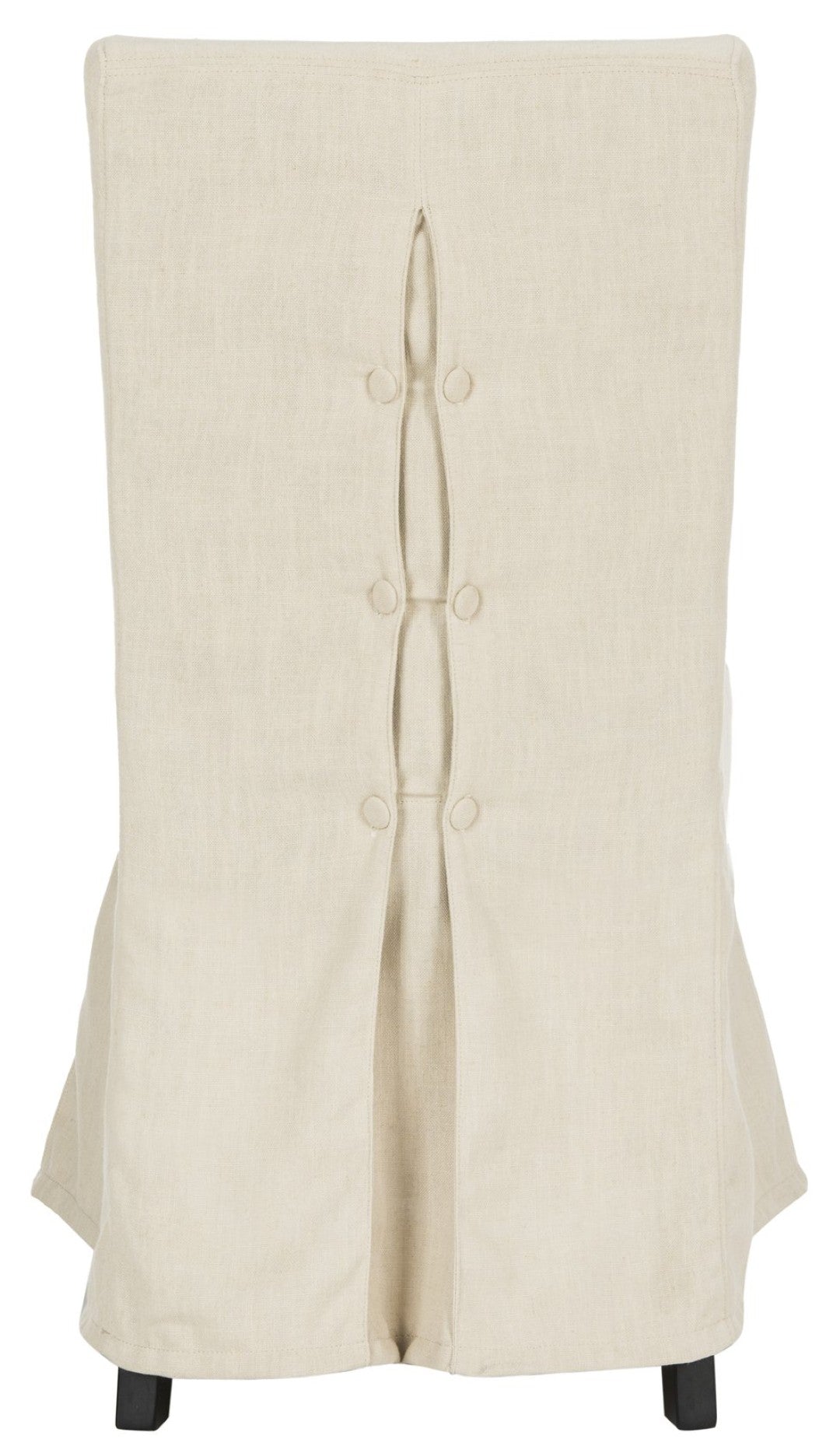Perennially chic and effortlessly versatile, this slipcovered side chair updates dining and workspace settings with refined tailoring and classic proportions. Upholstered in a soft beige viscose-linen blend and finished with black birch legs, the Suzie chair combines couture detailing—like a double row of buttons and back kick pleats—with comfortable, everyday function.