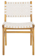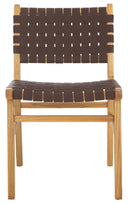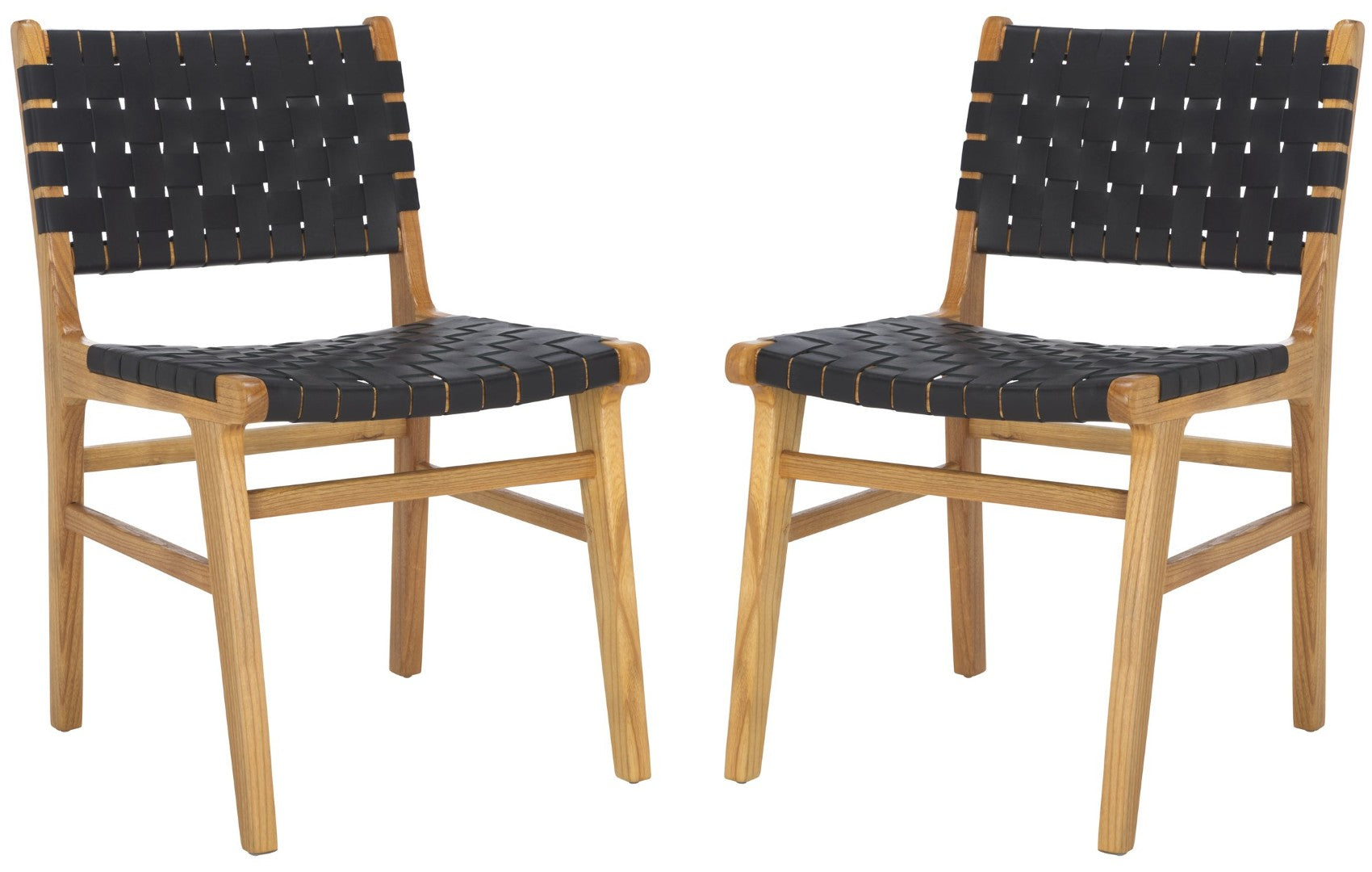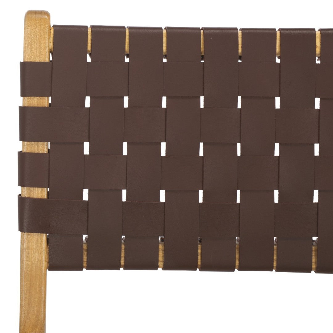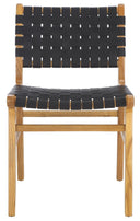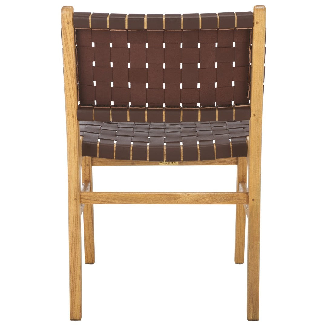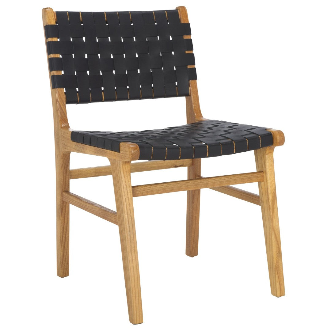Elevate your dining space with the Taika woven leather chair — a refined blend of contemporary design and artisan craftsmanship. The hand-woven black leather seat and back deliver tactile luxury and visual interest, while the natural mindi (sungkai) wood frame provides warm contrast and sturdy support. Perfect for modern or transitional dining rooms, sold in sets of two for easy styling and balance.