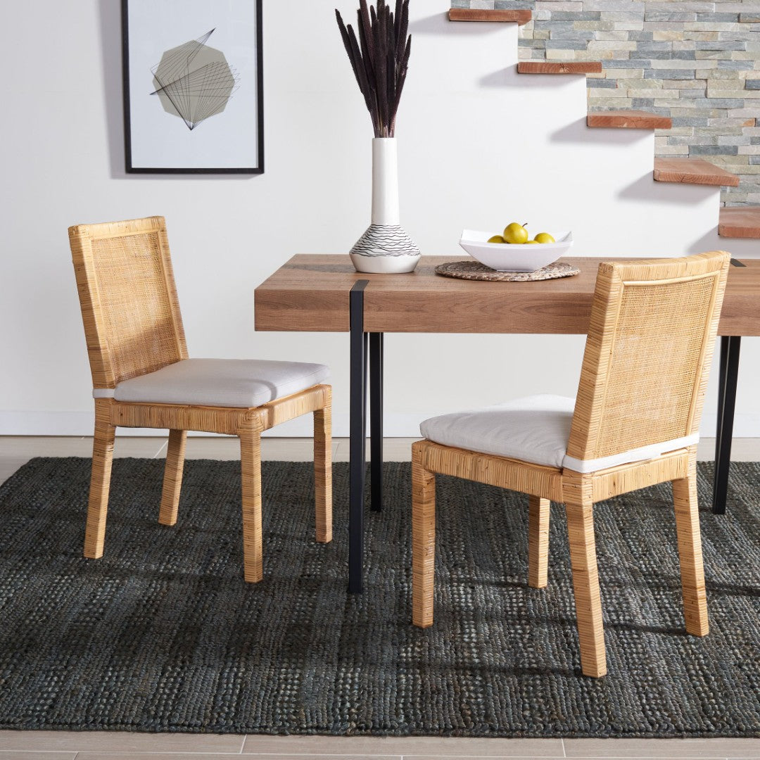 Bring relaxed coastal charm to your dining area with this Tojo cane dining chair. Its natural rattan frame and clean white cushion combine breathable texture with comfortable seating—ideal for everyday meals or casual gatherings. Lightweight yet sturdy, the chair complements coastal, bohemian, and modern farmhouse interiors while making table time feel inviting.