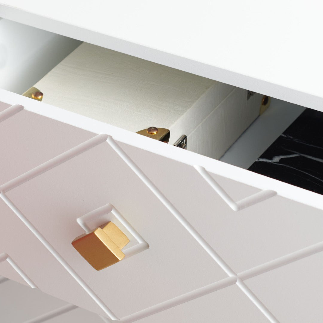 - Hardware & Base: Diamond-Shaped Gold Pulls And Matching Gold Mid-Century Style Base For Cohesive, Luxe Detailing