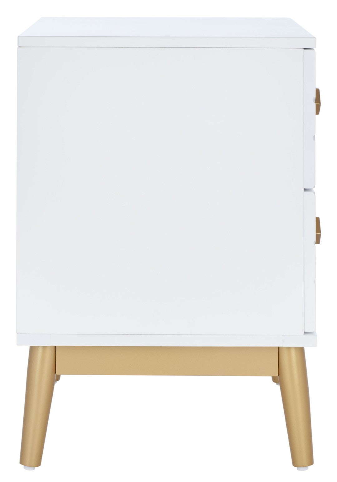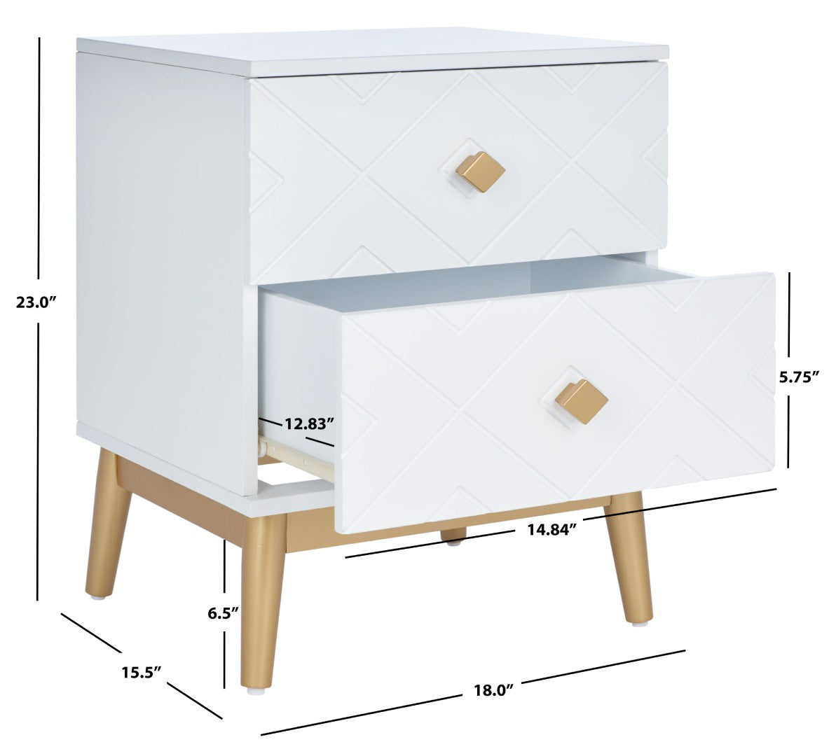 Elevate Your Bedroom With The Wilfred Two-Drawer Nightstand—Where Mid-Century Glamour Meets Modern Functionality. Its Eye-Catching Concentric Diamond Pattern And Gold Diamond-Shaped Pulls Add Sculptural Depth And Shine, While The Gold Mid-Century Base Provides Stable Support And A Refined Silhouette. Crafted From Mahogany And Mdf With A White And Gold Finish, This Nightstand Blends Durable Construction With Decorative Appeal To Create A Stylish Focal Point Beside Your Bed.