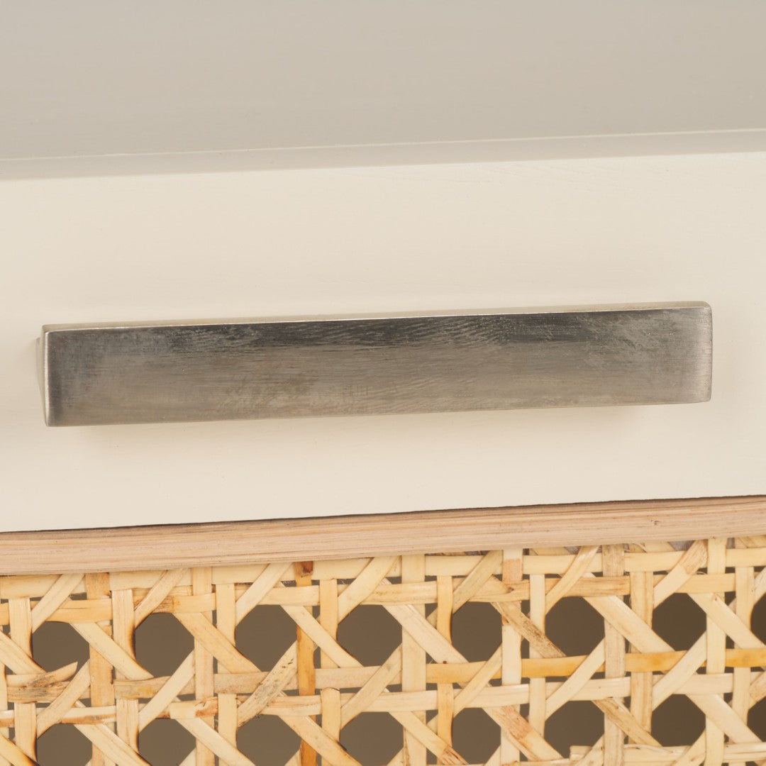 - Finish & Style: Smooth Black Finish Contrasted With Woven Natural Rattan Drawer Panels For A Warm, Textured Look