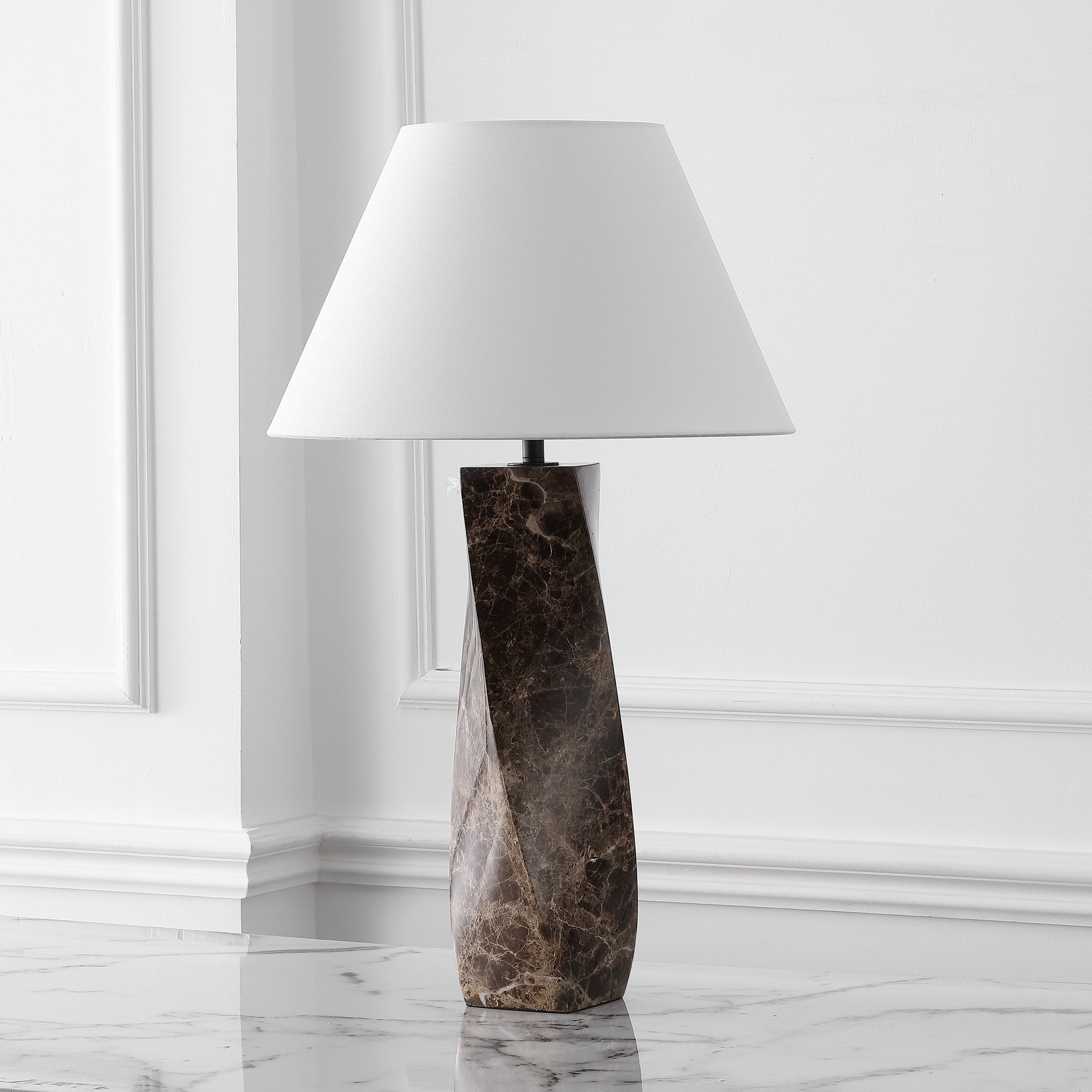 A timeless design meets modern functionality, as the sturdy marble base provides steadfast support while the smooth iron detailing adds a touch of refinement. The soft shade complements the lamp's overall look, offering a warm, welcoming glow that enhances your environment. This lamp is not just about illumination but also adds a statement of style and sophistication.
