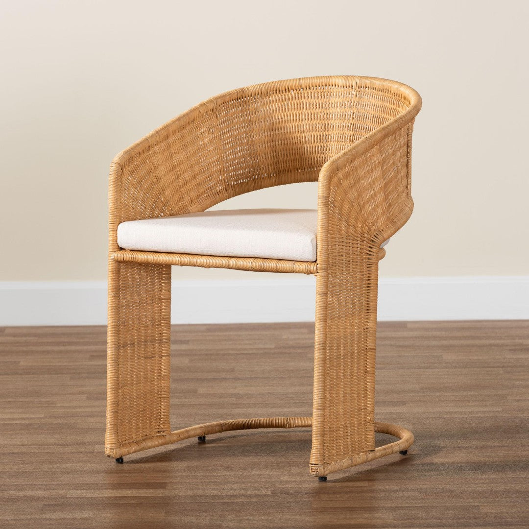Rustic bohemian charm meets lightweight comfort in this handcrafted Palm dining chair. Made in Indonesia from sustainably sourced natural rattan over a sturdy metal frame, the chair pairs an open, airy silhouette with a plush removable cushion for all-day seating. Its gracefully curved back, sloping armrests, and U-shaped base create a relaxed yet refined profile that complements coastal, boho, and modern farmhouse interiors.