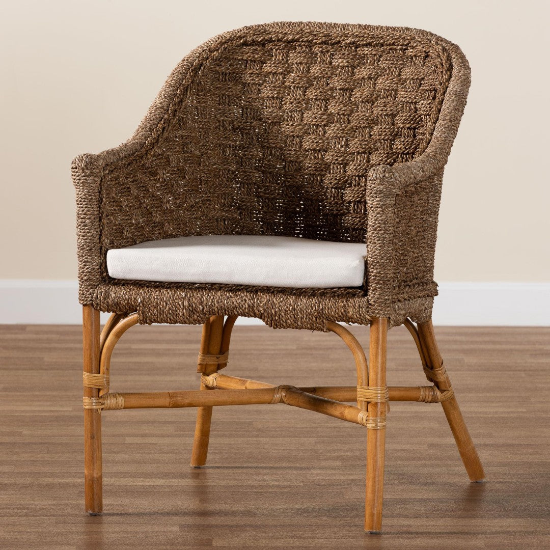Bring a relaxed, tropical sensibility to your living room, sunroom, or covered patio with this handcrafted Bohemian arm chair. Expertly woven from natural seagrass around a rattan frame, its rounded back and sloping armrests cradle the body for comfortable lounging. A removable, foam-padded seat cushion upholstered in soft fabric adds plush support while the airy basketweave and crisscross base introduce organic texture and visual interest—perfect for coastal, boho, or eclectic interiors.