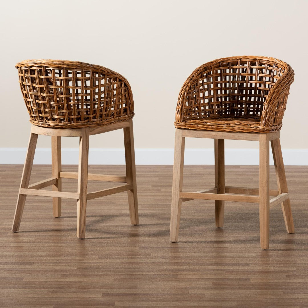 Bring a relaxed, modern-bohemian vibe to your kitchen or bar area with this Mario counter stool set. Crafted in Indonesia from solid teak and natural rattan, the stools combine durable construction with warm, organic texture and thoughtful comfort features—fully assembled for immediate use.