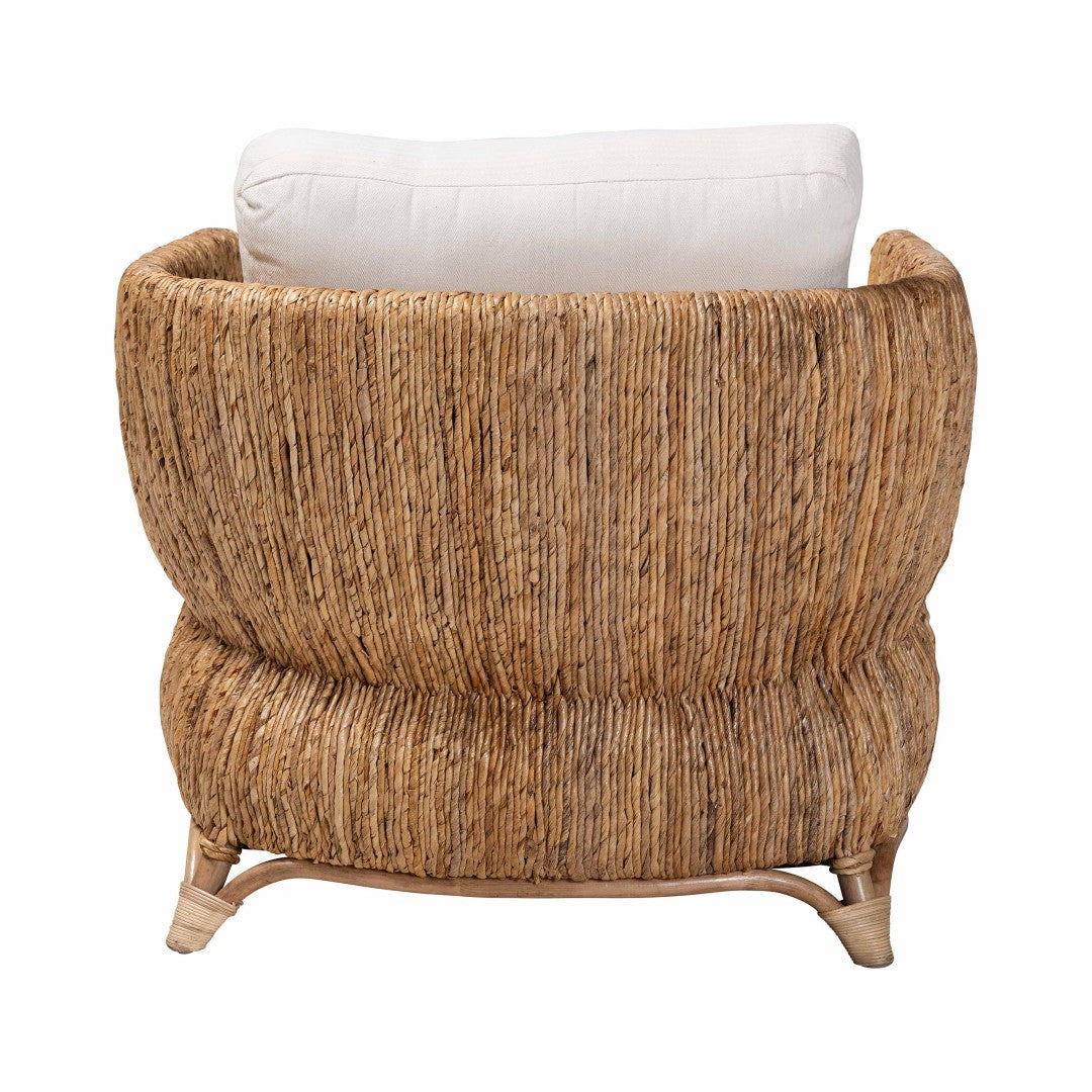 Bring a relaxed, bohemian elegance to your living space with the Roma armchair — a handwoven lounge chair crafted in Indonesia from sustainably sourced natural rattan and seagrass. Its sculptural, rounded frame and wide, flared armrests create a striking yet inviting silhouette that highlights the warm texture of seagrass. Deep seating and plush, removable cushions make this piece ideal for lounging, reading, or adding a coastal, artisanal accent to any room.