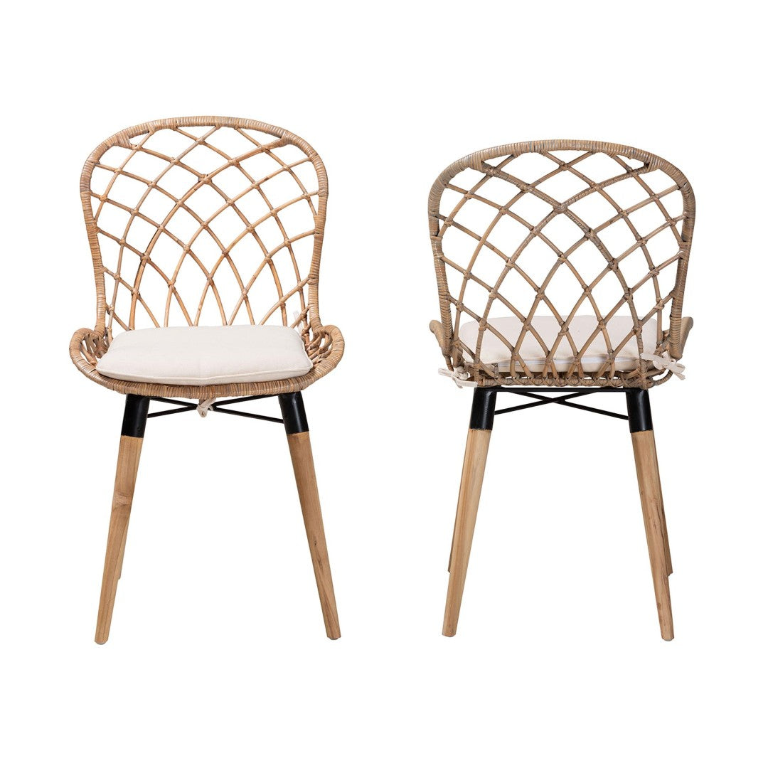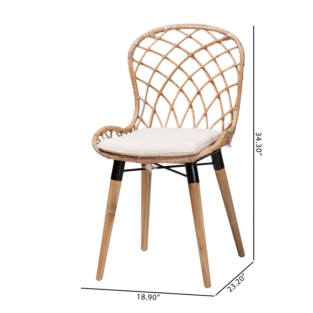 Bring relaxed Bohemian elegance to your dining space with the Sabelle dining chairs — a handcrafted two-piece set that combines natural materials, midcentury-inspired lines, and modern comfort. Made in Indonesia from teak wood, rattan, and metal, each chair features a sculptural rounded back of slim rattan rods, an upholstered removable cushion for everyday comfort, and a sturdy crisscross stretchered base for lasting stability. Subtle variations in color and texture make every chair unique, adding authentic character to your home.