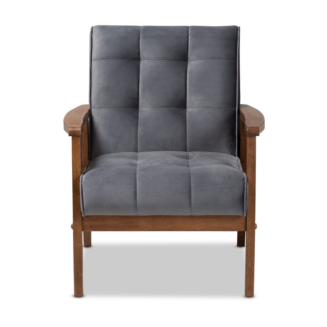 Add a touch of mid-century sophistication to your living room or reception area with the Asta armchair. Its low-profile silhouette, walnut-finished solid rubberwood frame and angled legs combine classic retro cues with modern comfort. Plush grey velvet upholstery, foam padding and biscuit tufting create an inviting seat that looks upscale while remaining versatile for a variety of interiors. Made in Malaysia and designed for easy placement in home or commercial settings.