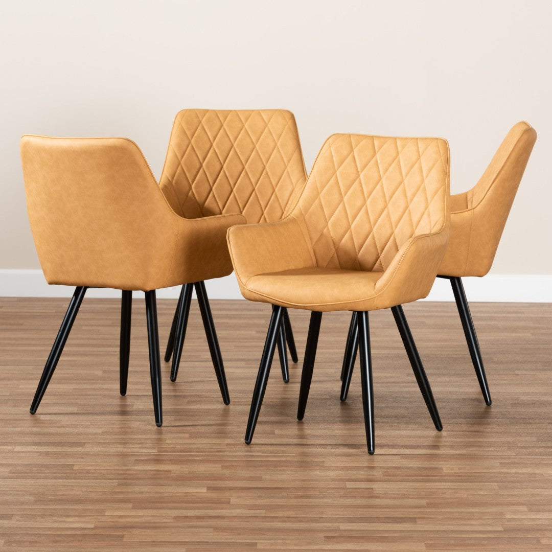 Add a touch of mid-century modern flair to your dining area with the Astrid dining chair set. Blending clean, retro-inspired lines with contemporary materials, each chair balances comfort and style—perfect for everyday meals or entertaining. The tan faux leather upholstery, diamond-stitch detailing, and splayed black metal legs create a refined yet approachable look that complements a variety of decor styles.