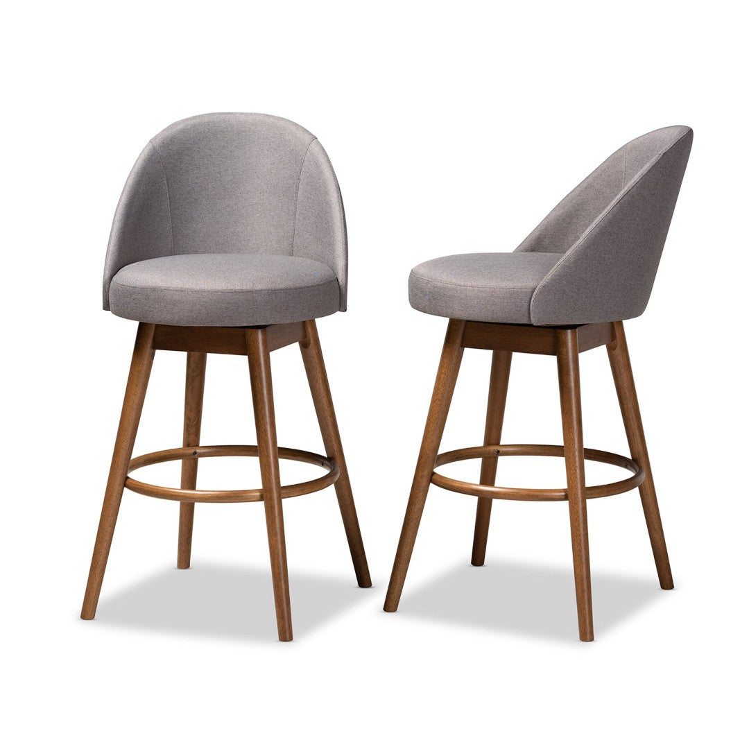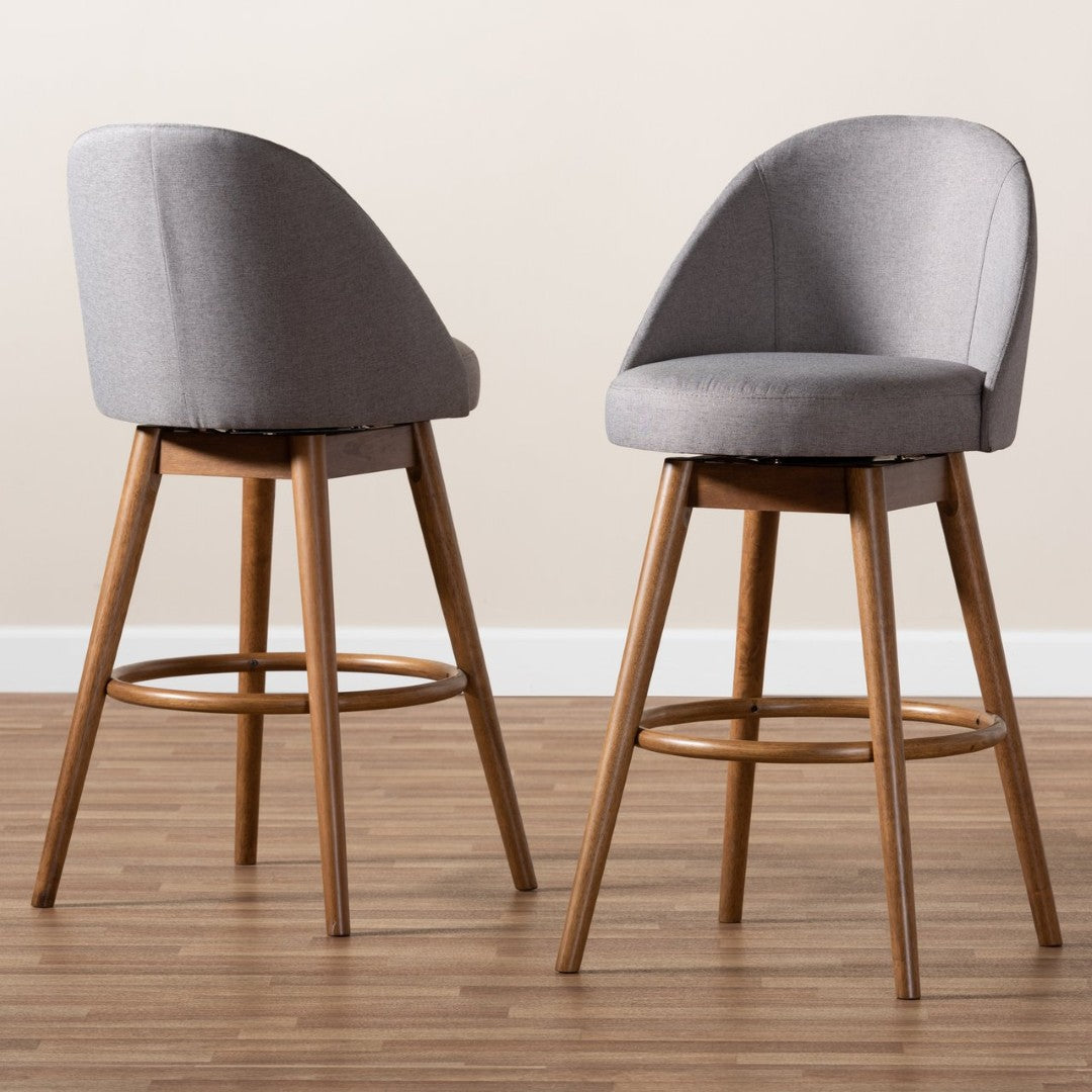 Bring mid-century modern style and everyday comfort to your home bar with these Carra swivel bar stools. Thoughtfully designed with warm walnut-finished wood, soft grey polyester upholstery, and foam-padded seating, this set of two balances retro flair with practical features like a built-in footrest and 360° swivel for relaxed conversation and easy movement.