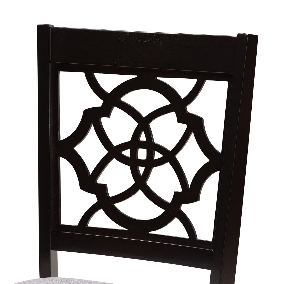 Elevate your dining room with the Renaud 2-piece chair set — a refined blend of contemporary styling and traditional craftsmanship. These chairs pair a soft grey upholstered seat with a rich dark brown wood frame for a versatile look that suits both casual family meals and formal gatherings. Thoughtfully designed details like the cut-out back and ring-turned legs add visual interest while the foam-padded seat ensures comfortable dining for extended conversations.