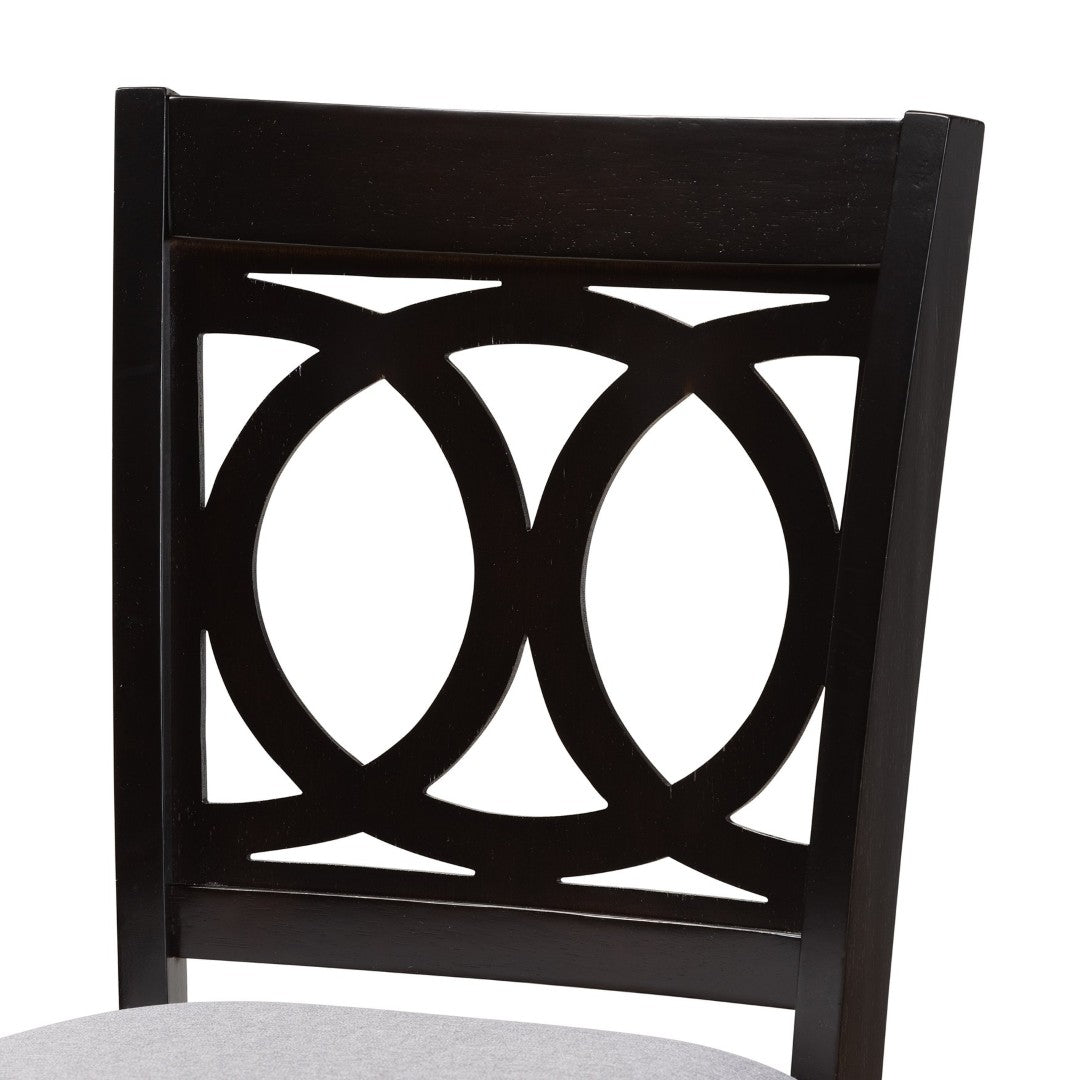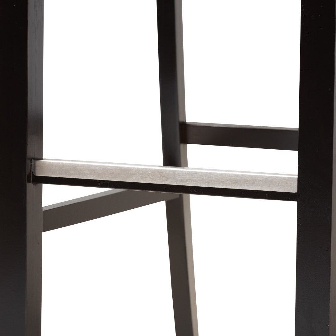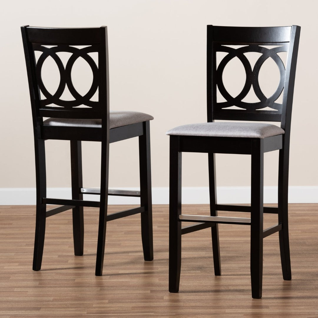 Experience modern comfort and refined style with this 2-piece bar stool set, thoughtfully designed for both residential and commercial spaces. Each stool blends a warm espresso wood frame with soft grey fabric upholstery and foam padding to deliver supportive seating, while the distinctive cut-out back and silver metal footrest add contemporary flair and durability.