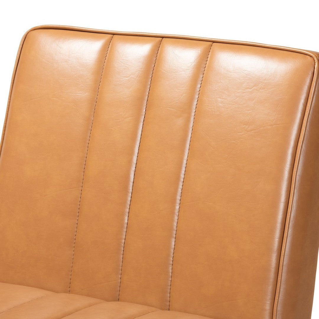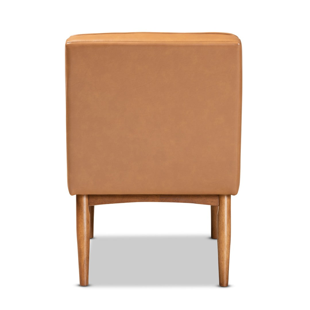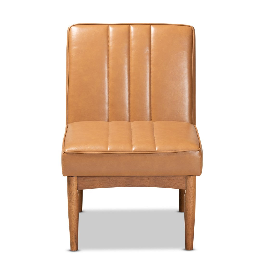 Update your dining area with the Daymond chair — a mid-century modern piece that blends sleek style, durable construction, and everyday comfort. Its warm walnut brown wood finish and tan faux leather upholstery create a timeless look that fits both casual and refined interiors, while thoughtful padding and channel tufting provide lasting comfort and visual interest.