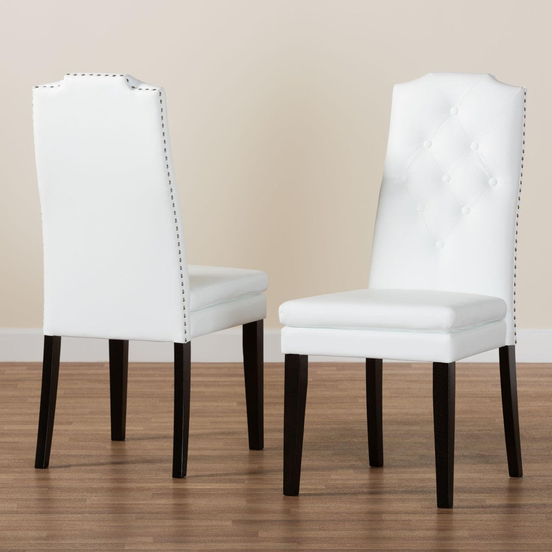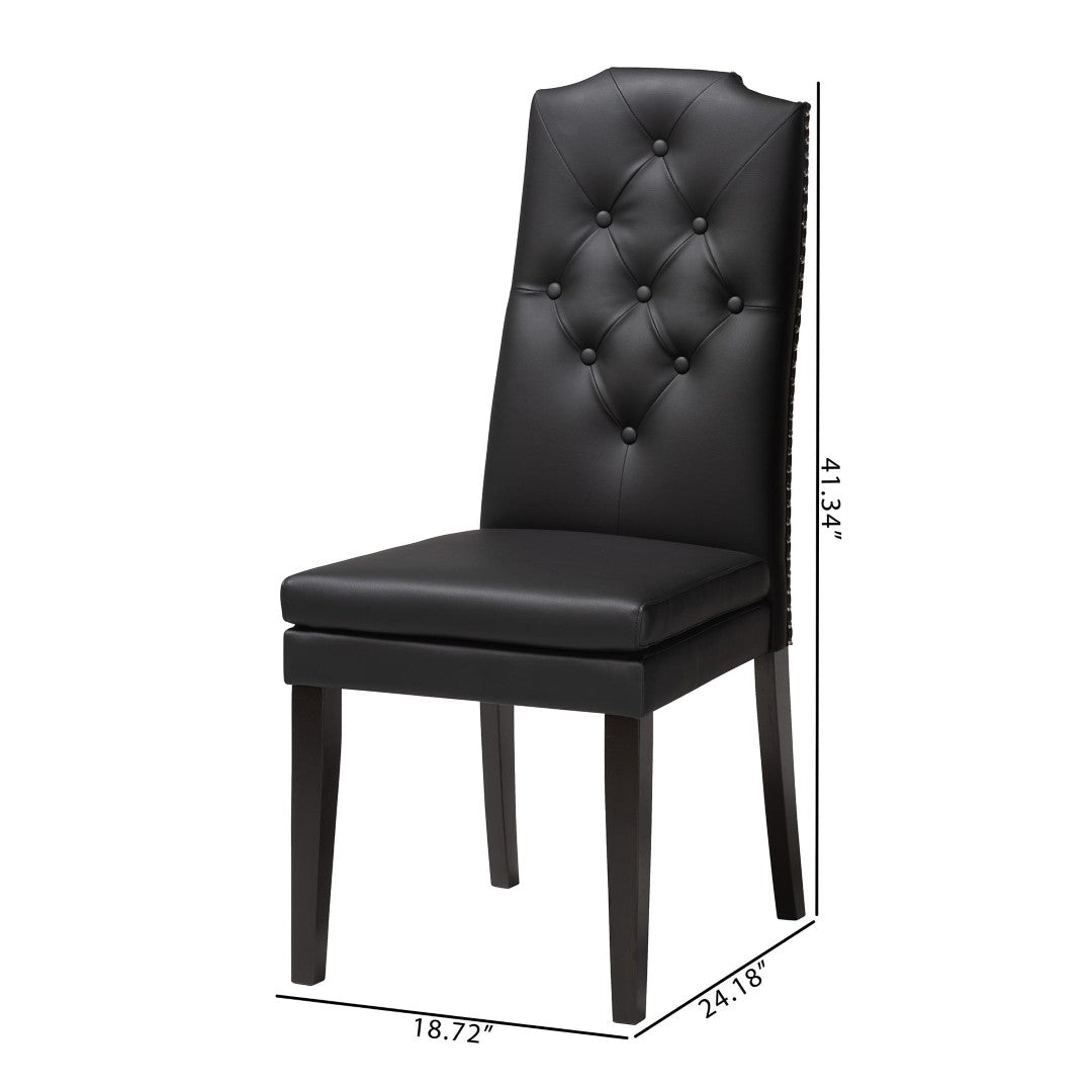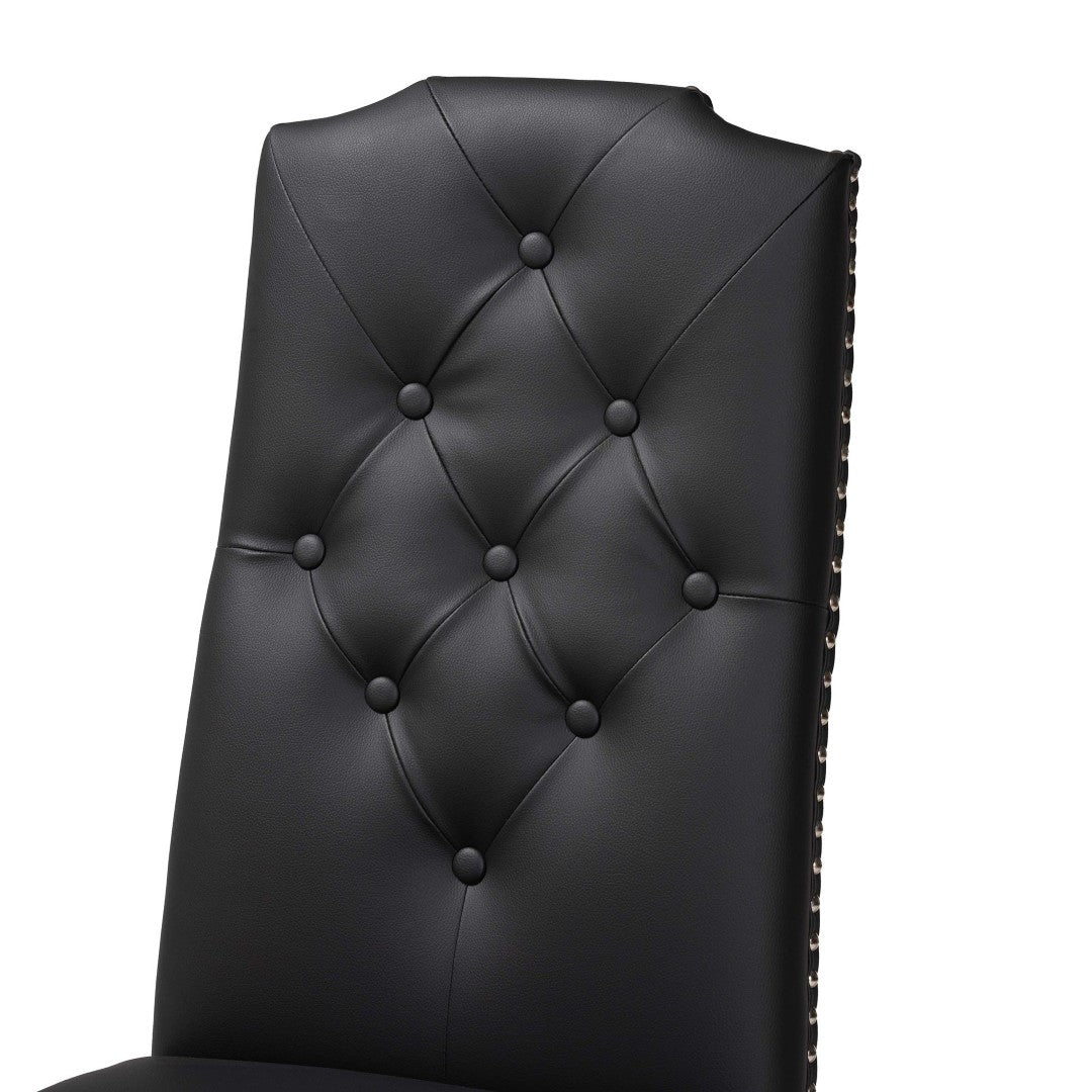 Elevate your dining space with the Dylin dining chair — a refined blend of modern lines and classic detailing that delivers both style and comfort. Upholstered in rich black faux leather with elegant silver nailhead trim and deep button-tufting, this chair offers a sculpted silhouette and generous seating that suit contemporary and transitional interiors alike. Built on a solid rubberwood frame and foam-filled cushions, it balances durability with everyday comfort and requires simple assembly.