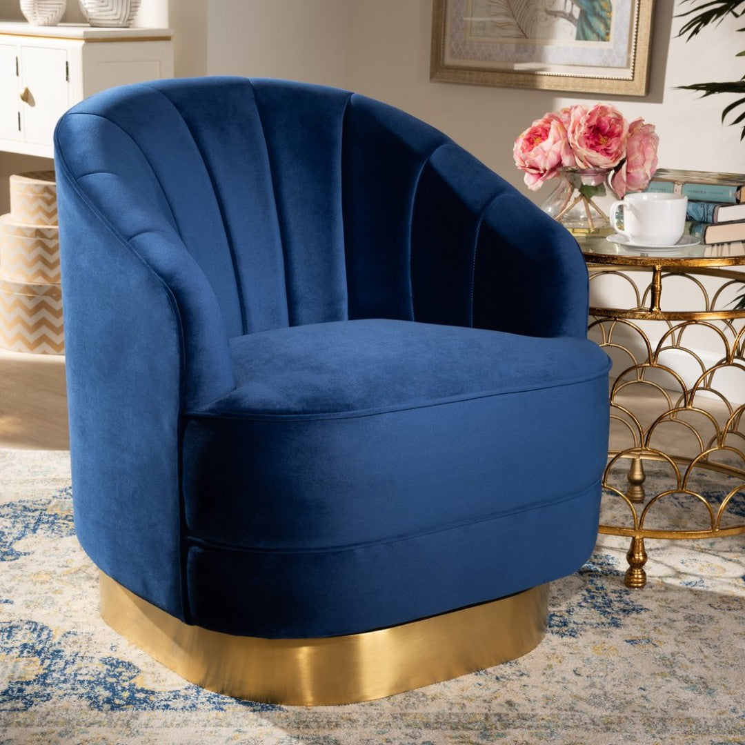 Experience elevated comfort and modern glamour with this sumptuous swivel accent chair. Upholstered in luxurious royal blue velvet, the chair blends soft, tactile comfort with refined design details like channel tufting and a brushed gold metal base—perfect for living rooms, bedrooms, or a chic lounge corner. Fully assembled and built with durable materials, it delivers style and function right out of the box.