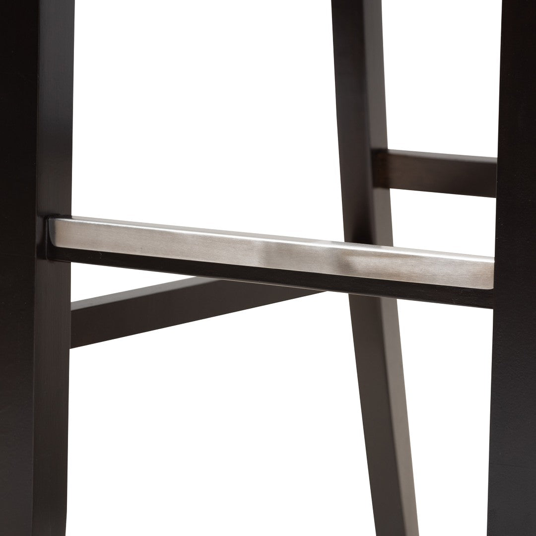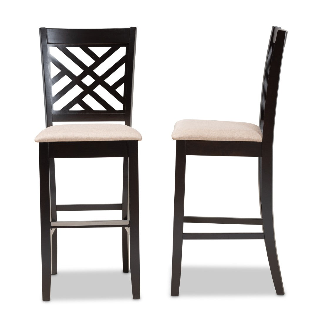 Refresh your bar or counter area with these contemporary Jason bar stools, designed for everyday comfort and modern appeal. Upholstered in soft sand-colored fabric and supported by a rich espresso brown wood frame, each stool combines a foam-padded seat, a stylish cut-out back, and a durable metal front footrest to deliver both comfort and long-lasting use in residential or commercial settings. Easy to assemble and built with quality materials, this 2-piece set brings refined casual seating to kitchens, home bars, cafes, and lounges.
