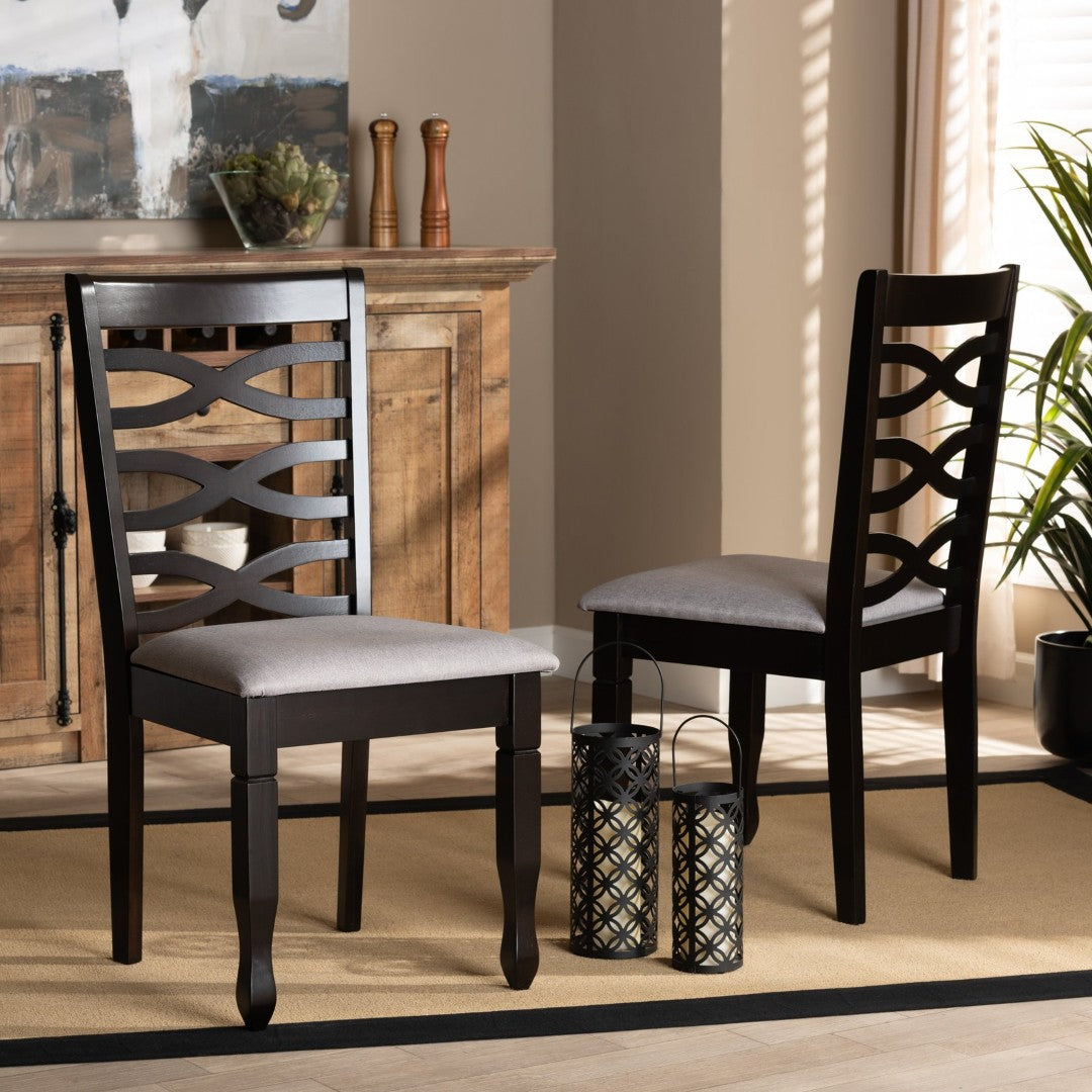 Elevate your dining area with the Lanier dining chair — a refined blend of modern lines and classic comfort. Thoughtfully crafted with an espresso brown wood frame and light grey fabric upholstery, this two-piece set delivers a tailored look and supportive seating for everyday meals or entertaining. The plush foam-padded seat, distinctive cut-out back design, and tapered legs create a cohesive silhouette that complements a variety of interior styles while remaining durable and easy to pair.