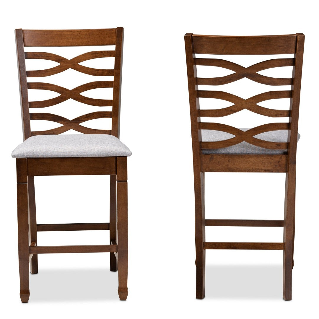 Elevate your kitchen or bar area with the Lanier pub chair set — a refined blend of modern lines and classic warmth. These counter-height chairs pair a soft polyester-upholstered seat with a walnut brown rubberwood frame for a look that’s both inviting and durable. Thoughtful details like the sculpted cut-out back, plush foam padding, and tapered legs create a comfortable seating experience while adding visual interest to contemporary or transitional dining spaces. Sold as a convenient two-piece set and made in Malaysia, these chairs are ideal for counter or pub-height tables.