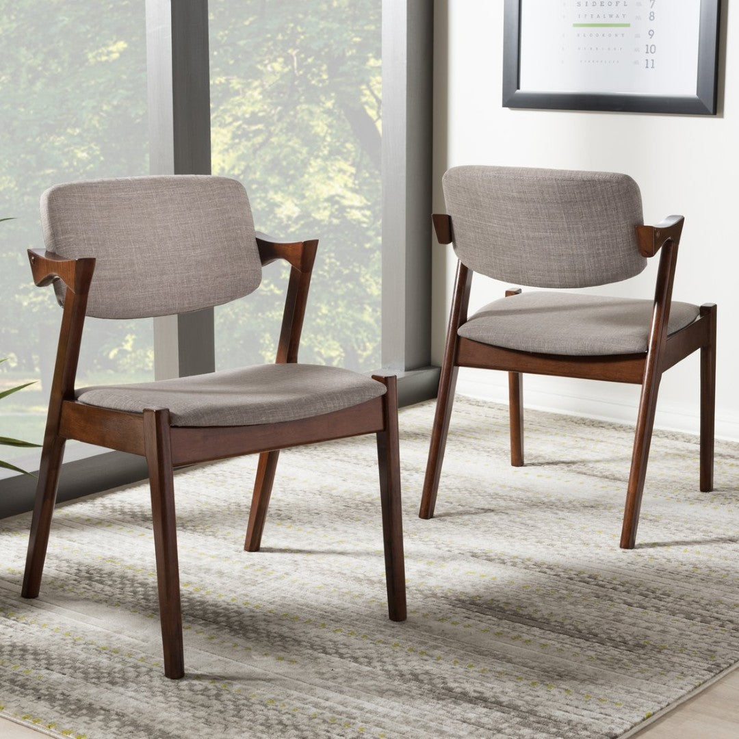 A refined mid-century dining armchair that blends sculptural Scandinavian lines with everyday comfort. Built with a solid rubberwood frame in a dark walnut finish and upholstered in soft light grey fabric, this chair delivers a stylish silhouette, adaptive seating, and durable construction suitable for dining rooms, kitchens, or modern office settings.