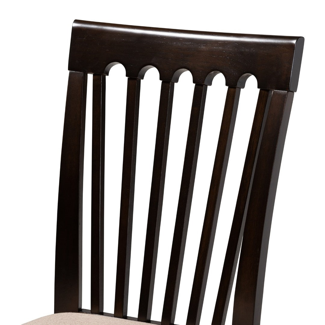 Elevate your dining room with the Minette chair — a refined blend of modern lines and everyday comfort. Crafted from solid rubberwood with a rich espresso finish and soft sand-colored polyester upholstery, this chair offers a polished look that works equally well for formal dinners or relaxed family meals. Thoughtful details like a plush foam-padded seat and a distinctive cut-out back add visual interest and ergonomic support, while durable construction ensures long-lasting performance.