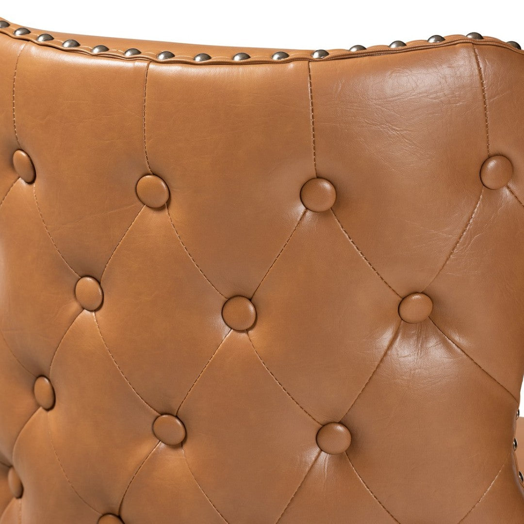 Add a touch of modern glamour to your kitchen, home bar, or counter with these stylish swivel bar stools. Combining warm walnut-brown wood, tan faux leather upholstery, and chic button tufting with a silver nailhead trim, this two-piece set delivers comfort, durability, and eye-catching detail for everyday use or entertaining. The padded seats and supportive backrests provide sustained comfort, while the swivel function adds convenience and easy conversation flow.
