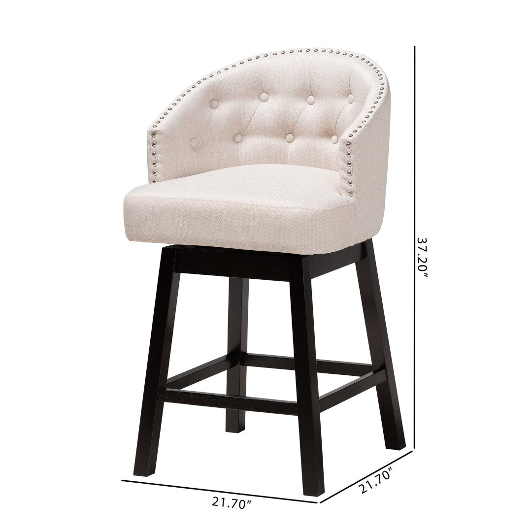 Elevate your kitchen island or home bar with the Theron counter stool set — a refined blend of mid-century charm and modern comfort. Thoughtfully crafted with a warm espresso wood finish and light beige fabric upholstery, these swivel stools offer stylish support for everyday dining or entertaining, featuring tailored details like button tufting and nailhead trim that enhance any transitional interior.