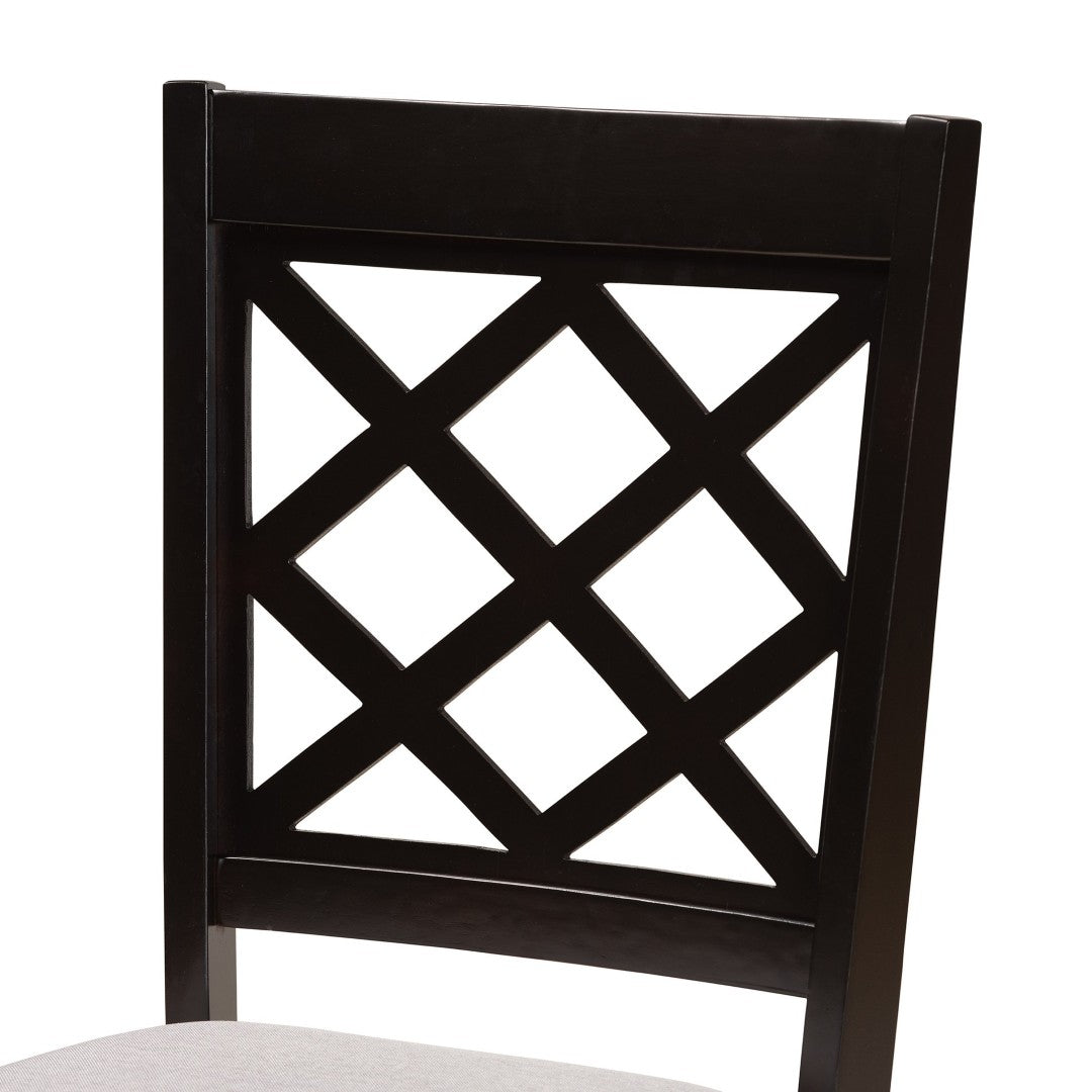 Elevate your dining space with the Verner dining chairs — a modern blend of sculpted form and everyday comfort. These two upholstered chairs pair light grey fabric with a rich dark brown wood finish for a refined, contemporary look. Thoughtful details like a plush foam seat, decorative cut-out back, and tapered saber legs create visual interest while providing supportive seating for daily meals or entertaining.