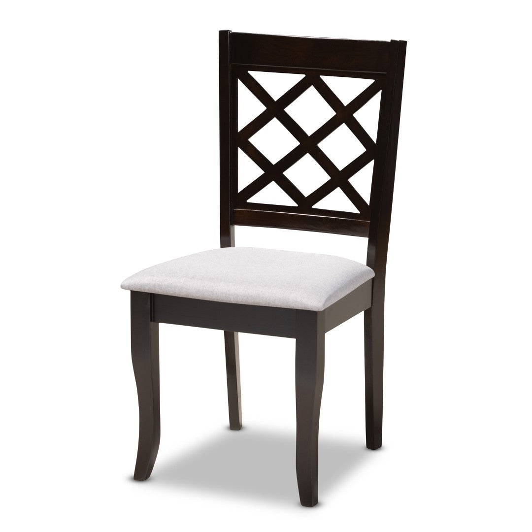 Elevate your dining space with the Verner dining chair, a refined blend of modern lines and classic details. Solid oak construction and an espresso brown finish provide durable support and timeless warmth, while the light grey polyester upholstery and plush foam padding ensure everyday comfort. Distinctive cut-out back detailing and saber-style legs add visual interest, making this set of four chairs a stylish, cohesive choice for contemporary or transitional dining rooms.