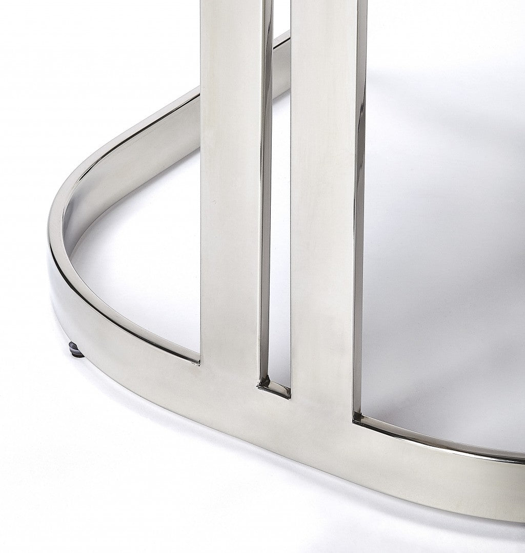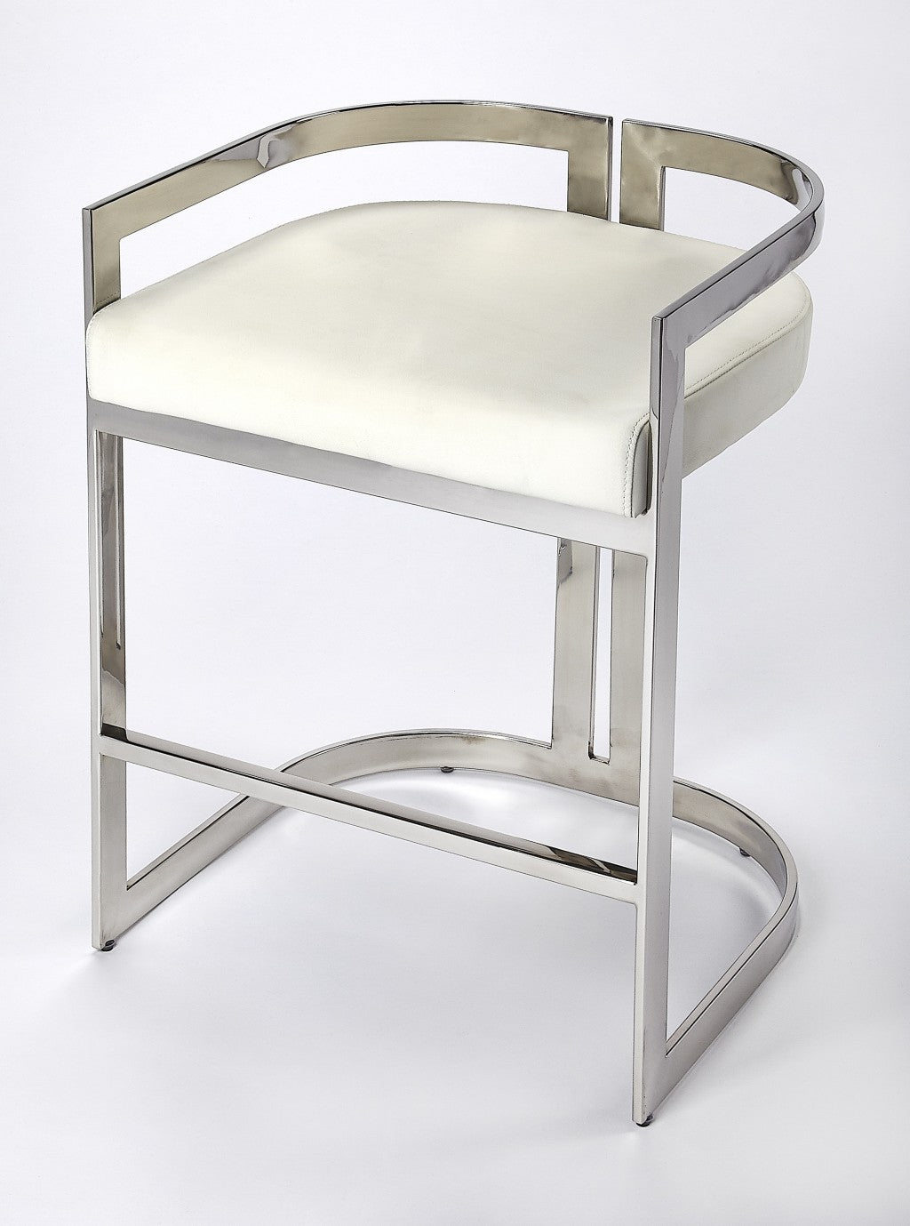 Comfort and design come together nicely in this 28-inch white and silver stainless steel and iron low back counter height bar chair. The silver coloration of the high quality iron base marries nicely with the white stainless steel seat. The rectangle shape of the seat combines with a low back to give this chair a comfortable and fashionable look. Designed with armrests for your comfort, this chair also features a footrest for comfort and convenience. 28-inch H x 20.25-inch W x 19-inch D