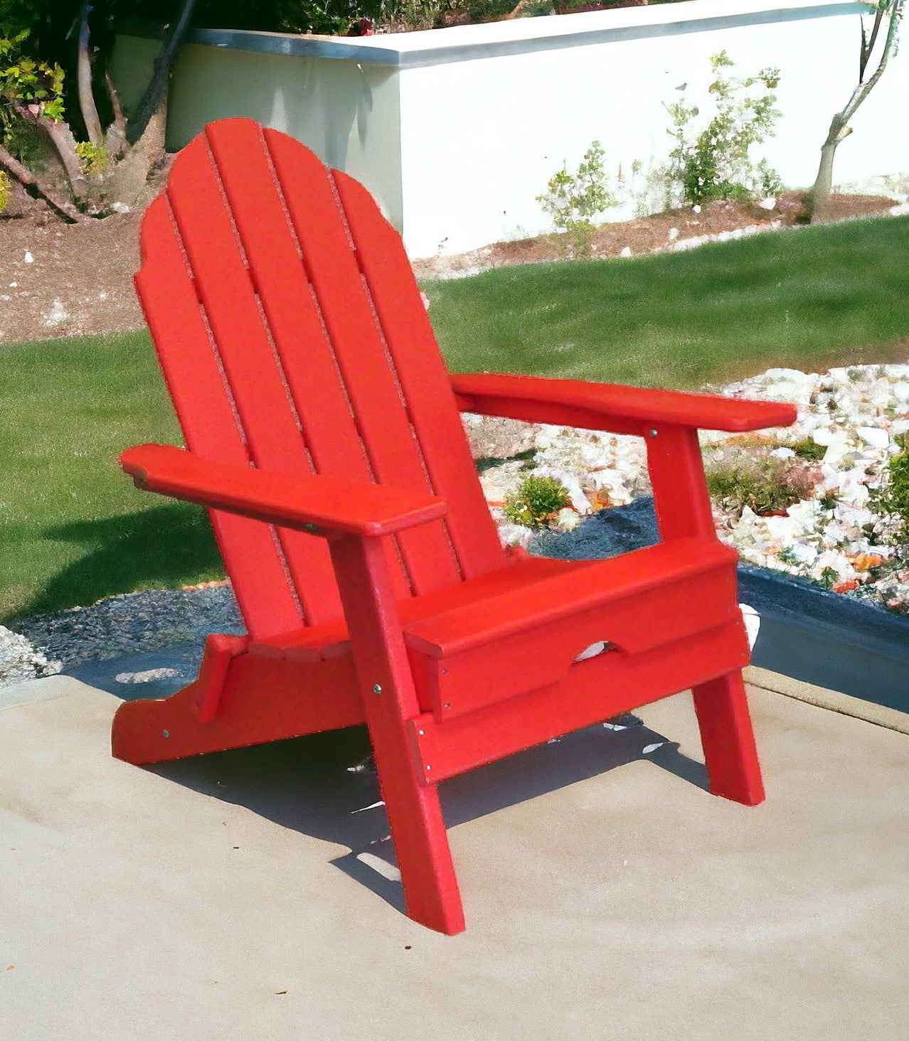 - Traditional red Adirondack chair with a seating capacity of 1.