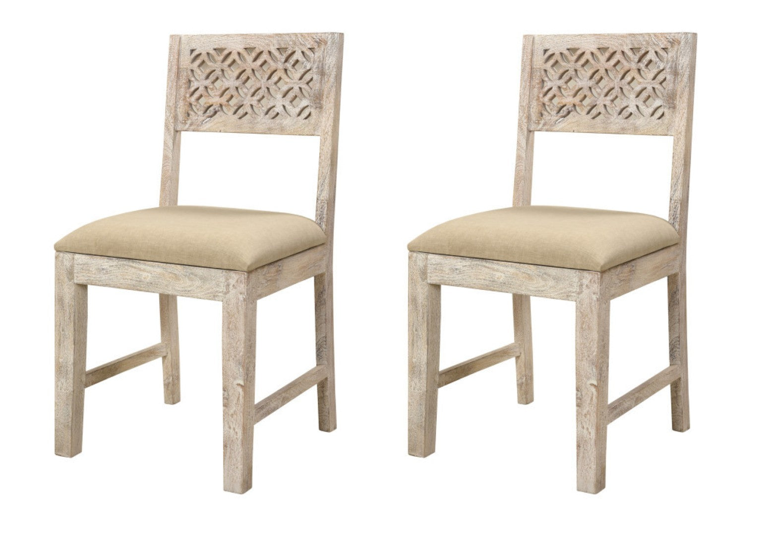 - Set of 2 dining chairs with carved backs backs. A rustic whitewash gives these chairs some modern farmhouse vibes.