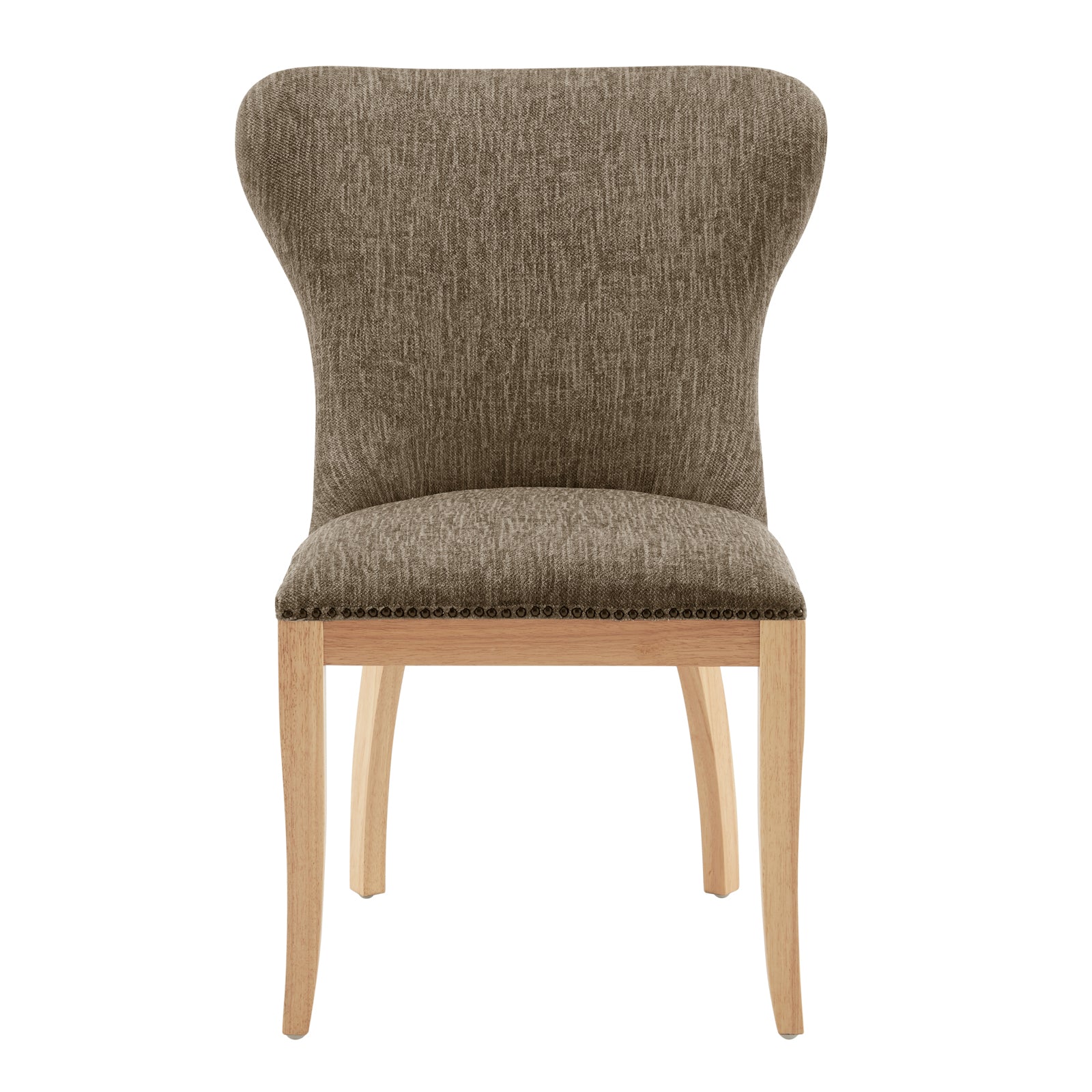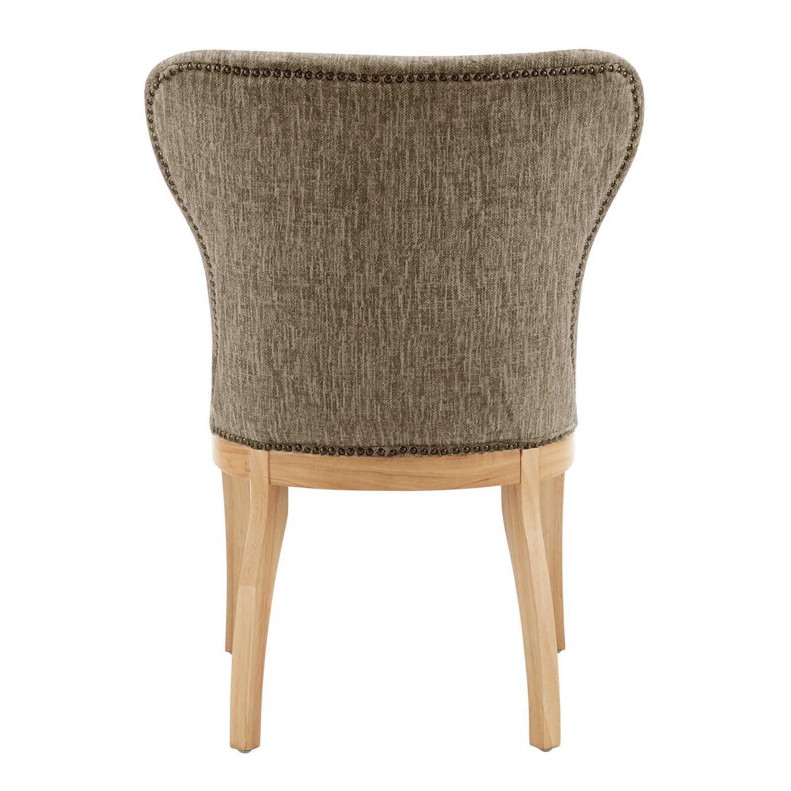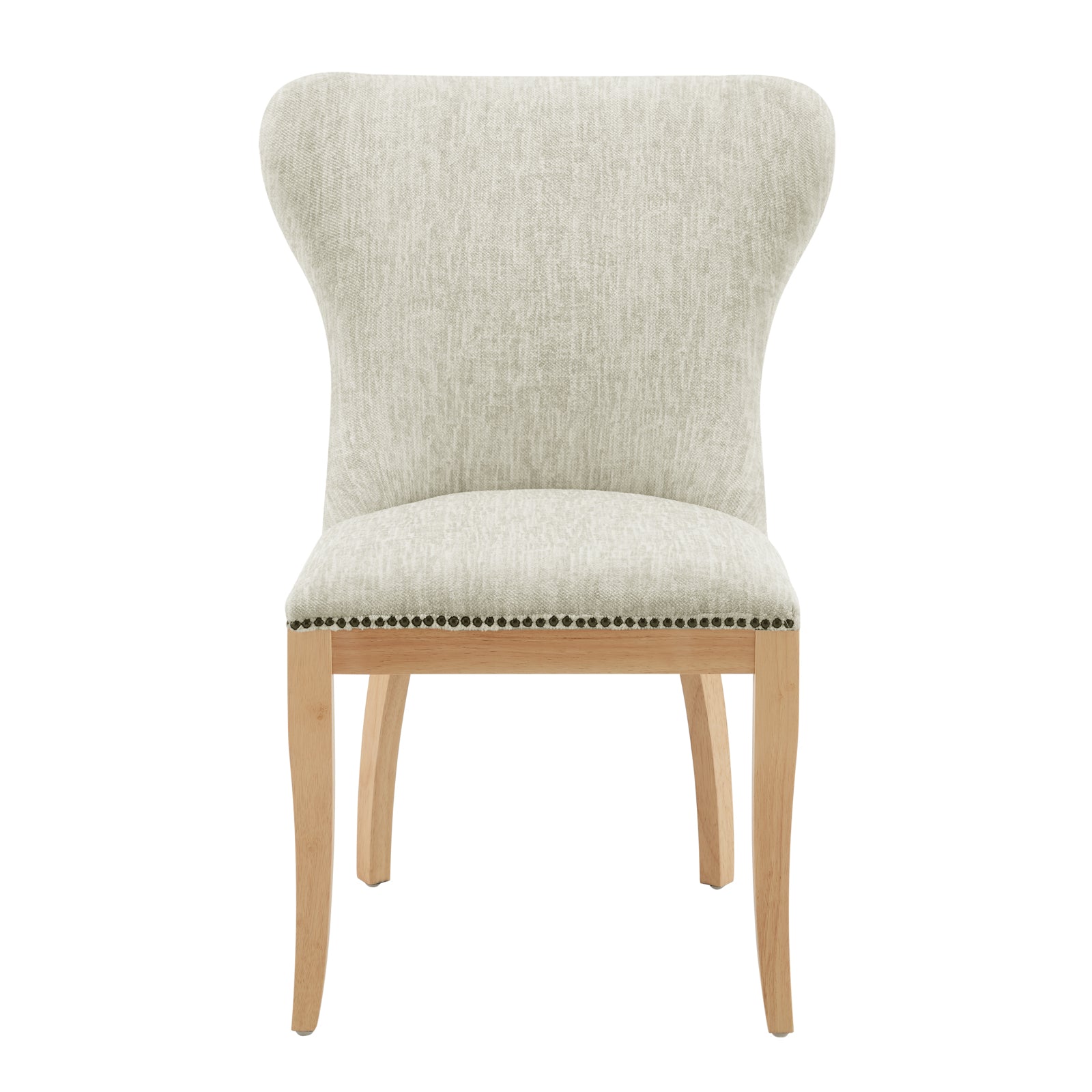 - Wing back style dining chair is elevated with texture and contrast by highlighting its quality polyester fabric upholstery and nailheads trim on splayed legs. An elegant dining furniture that also provides comfort and style for the rustic or farmhouse décor fans. Includes plastic glides for safety and stability.