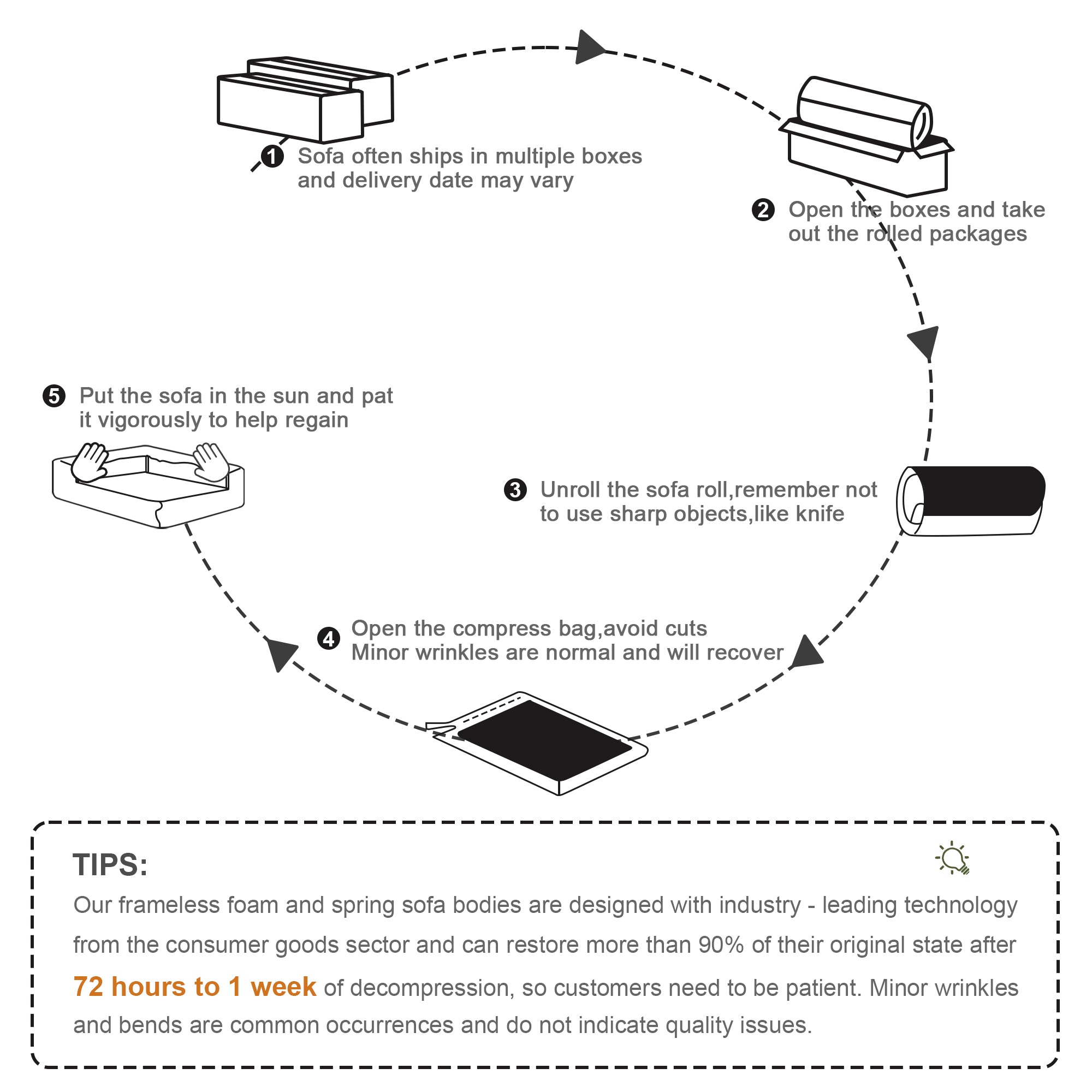- No Assembly Required: Our modular sofa eliminates the hassle of complicated furniture setup – it's ready to arrange right out of the box. Simply unpack all components and gently pat each module to activate its elasticity, restoring its beautiful shape.